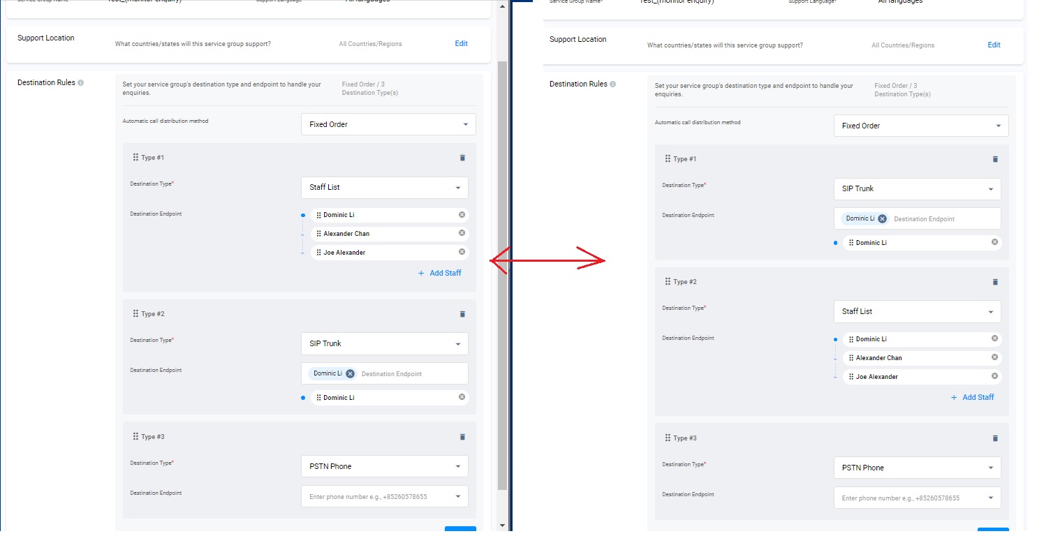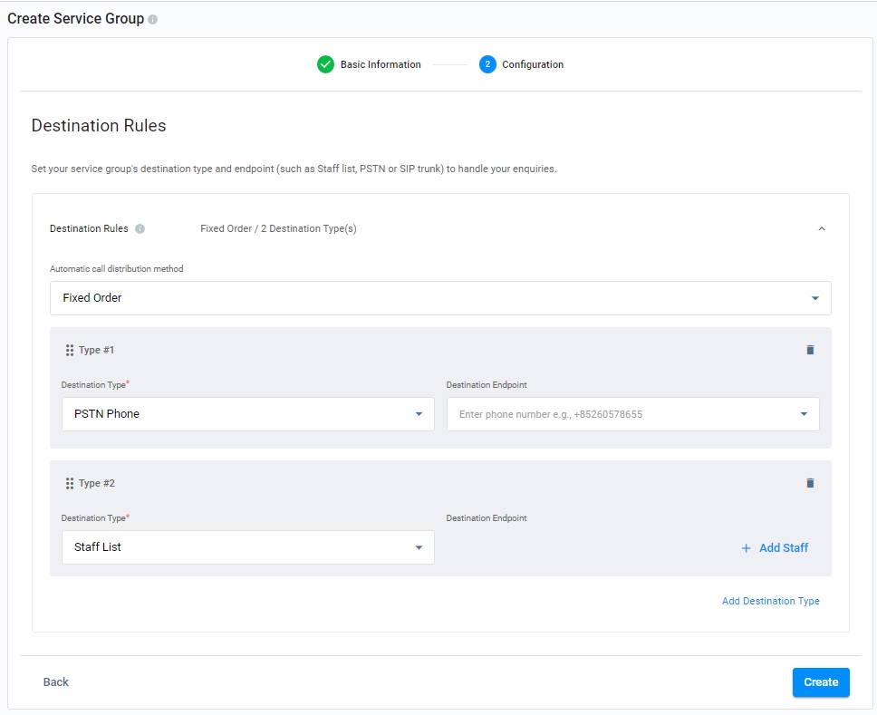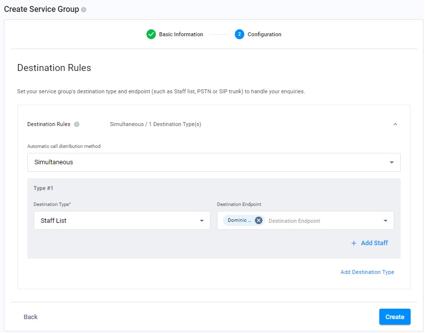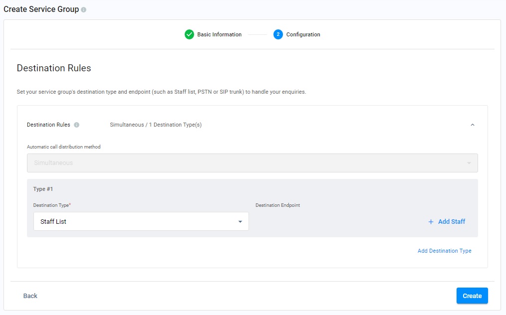 On the Destination Rules page, as long as the Call System is enabled, the Automatic Enquiry Distribution method is either the Simultaneous or Fixed Order selectable for your service group creation.