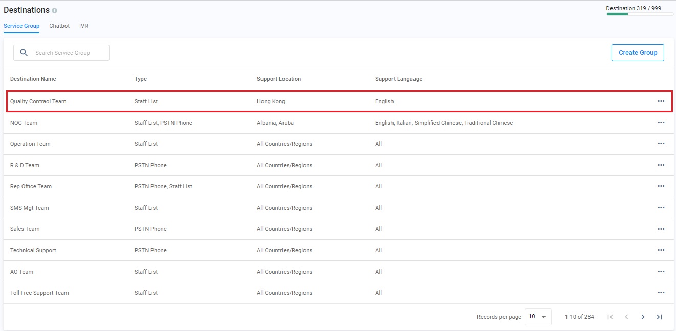 A newly created service group will be listed in the service group list and used in your channel routing.