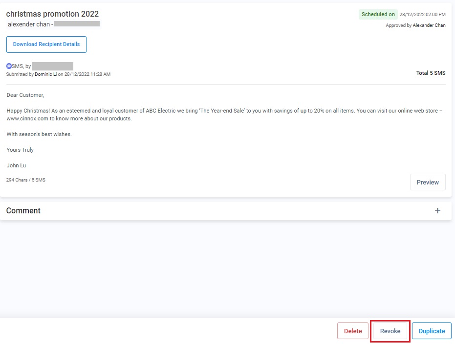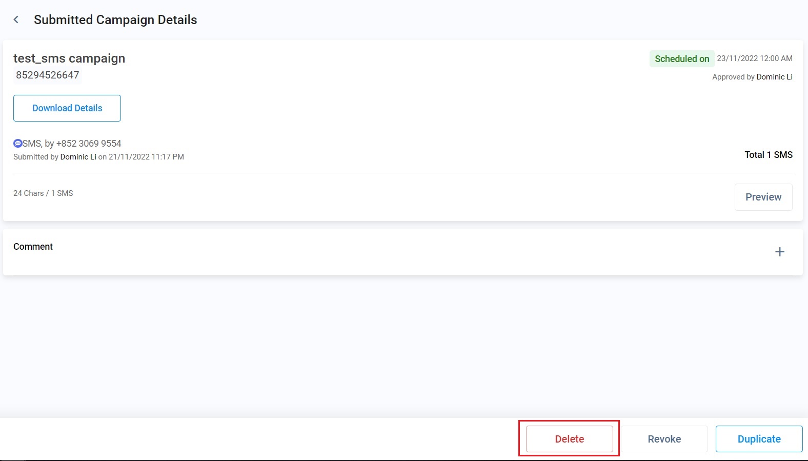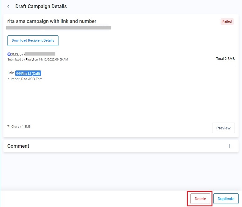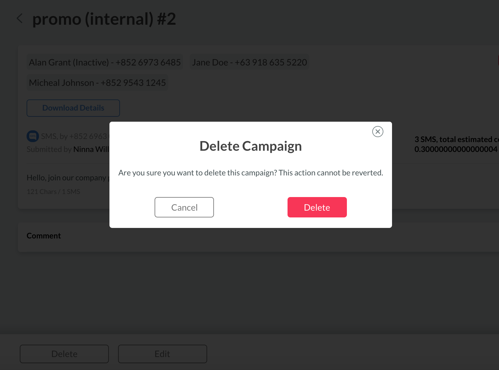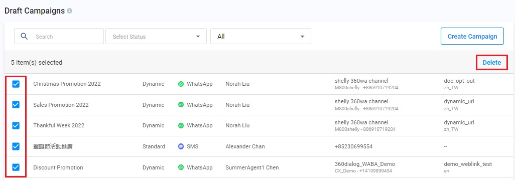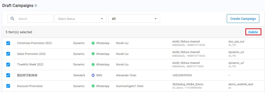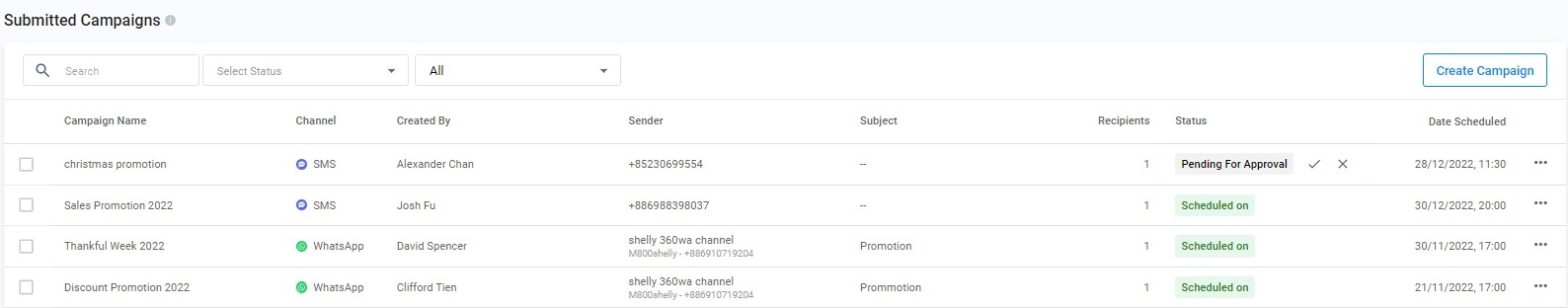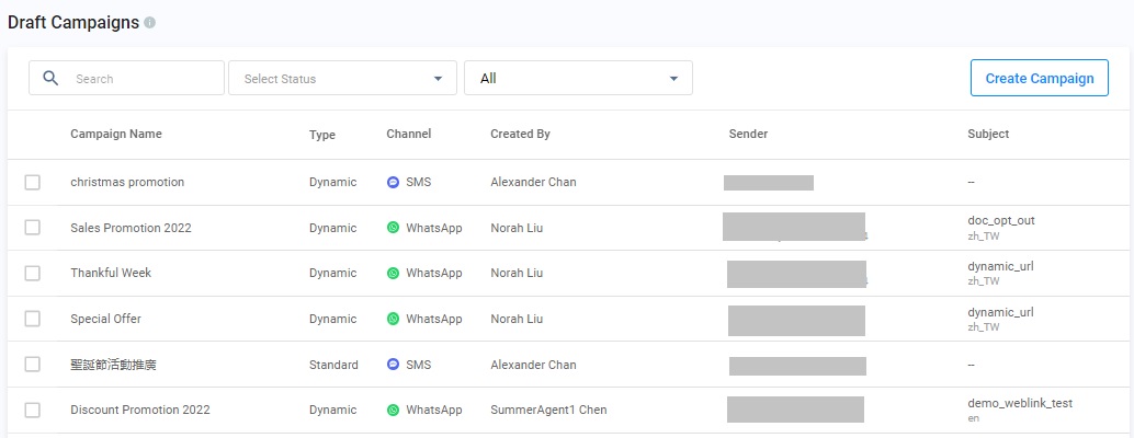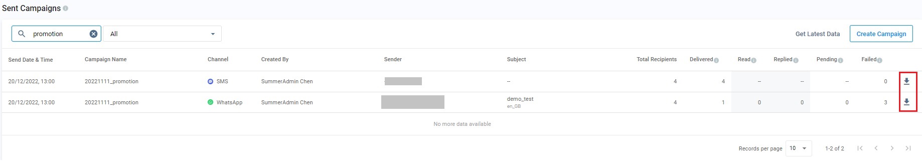 You can view and download the details of sent SMS and sent WhatsApp campaigns, including the campaign creator, the sender (SMS sender ID or WhatsApp channel name), the subject (WhatsApp campaign name), total recipients, dates and times sent, and the campaign's message status.