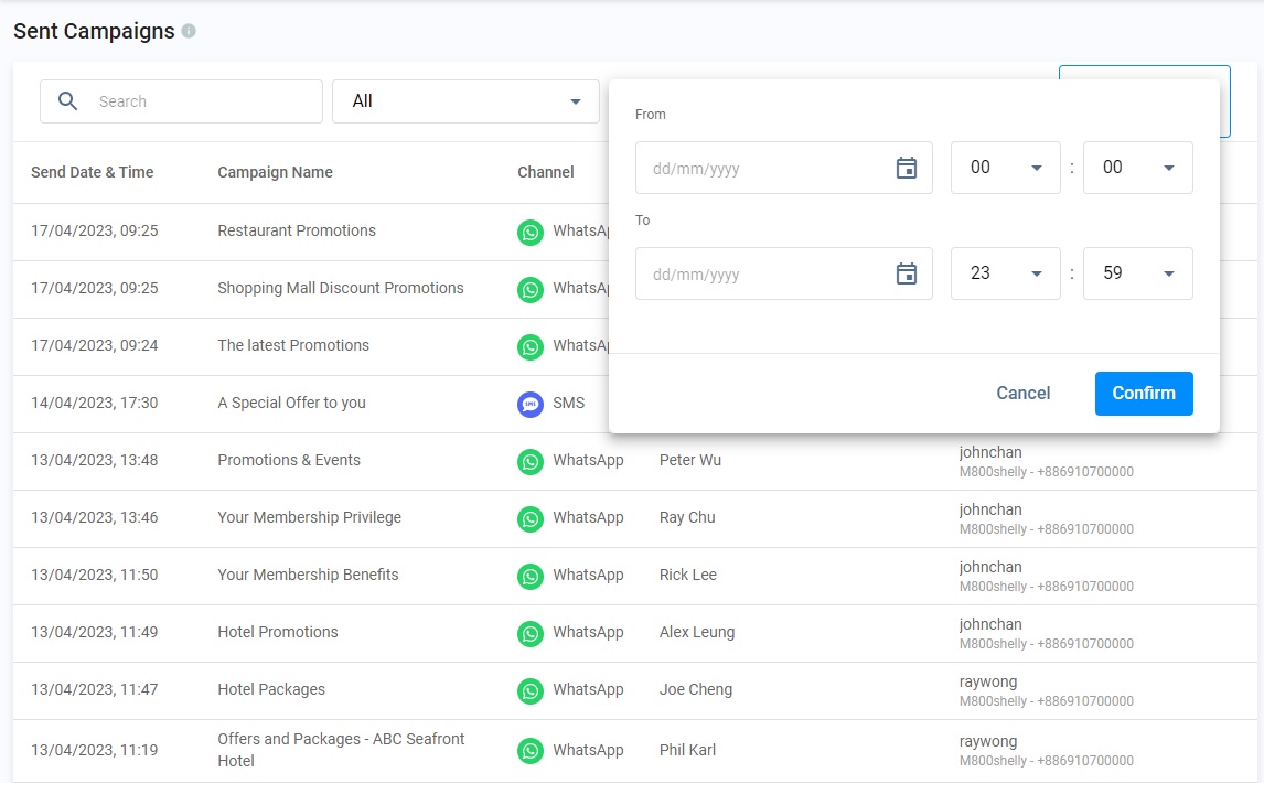 You can select one of the channel types of the Campaign, All, WhatsApp or SMS, or the following time frame to search your sent campaigns: