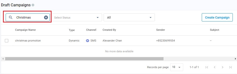 To search for draft campaigns, type in the campaign name in the search box. Relevant results display on the campaign list.