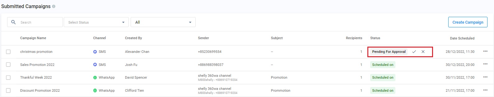 Campaigns Pending For Approval or In Progress means scheduled for sending lists under Submitted Campaign.