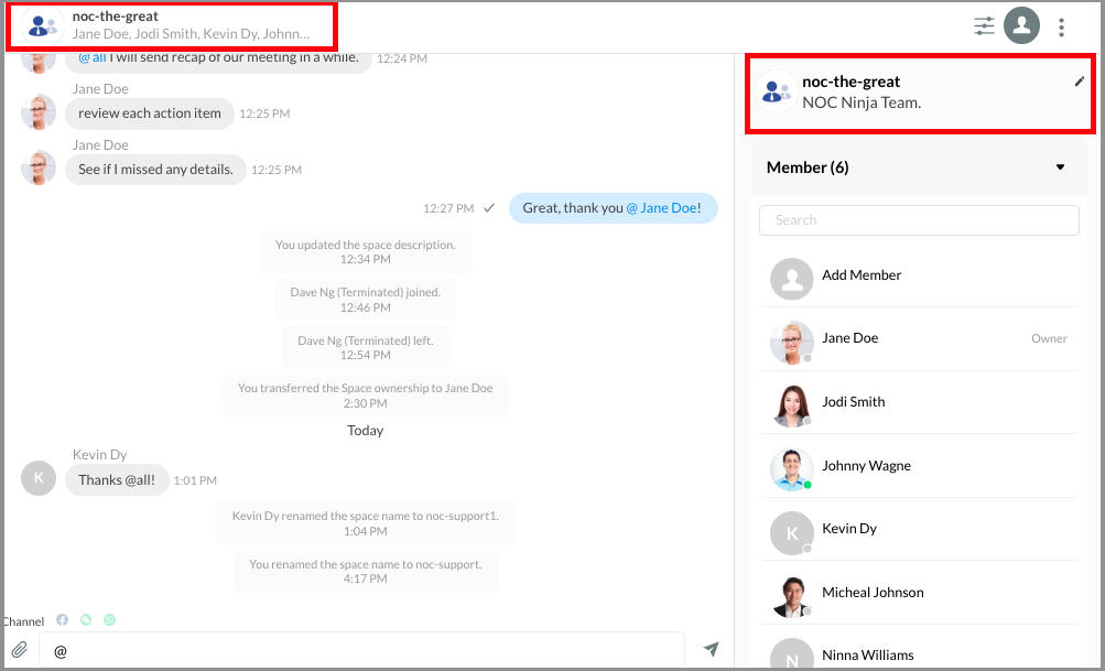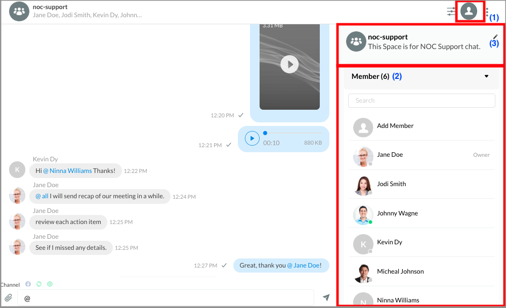 Space is CINNOX's group chat feature designed to facilitate seamless communication among staff members. Whether you're handling customer enquiries, participating in meetings, or engaged in various tasks and activities, Space allows you to stay connected and collaborate effectively.