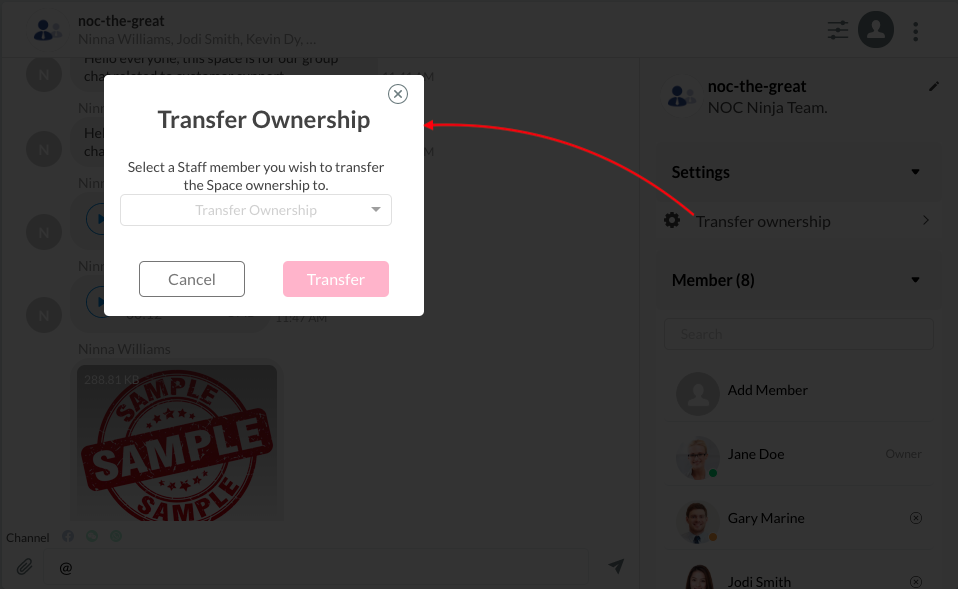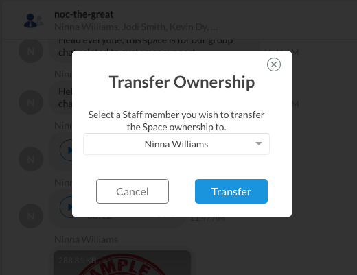 The Space will then display a system message indicating that the Space ownership has been transferred to another staff member.