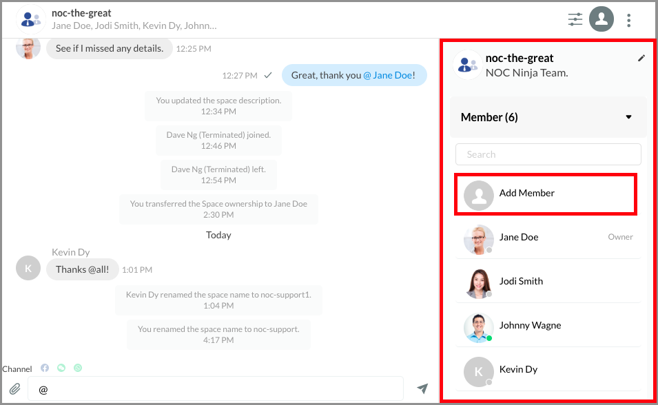 A notification will appear for the successfully added members, and their names will be added to the member list. The Space will also display a system message indicating the staff members have joined.