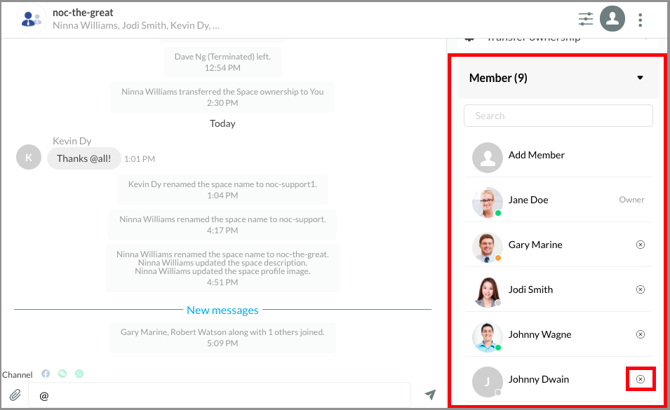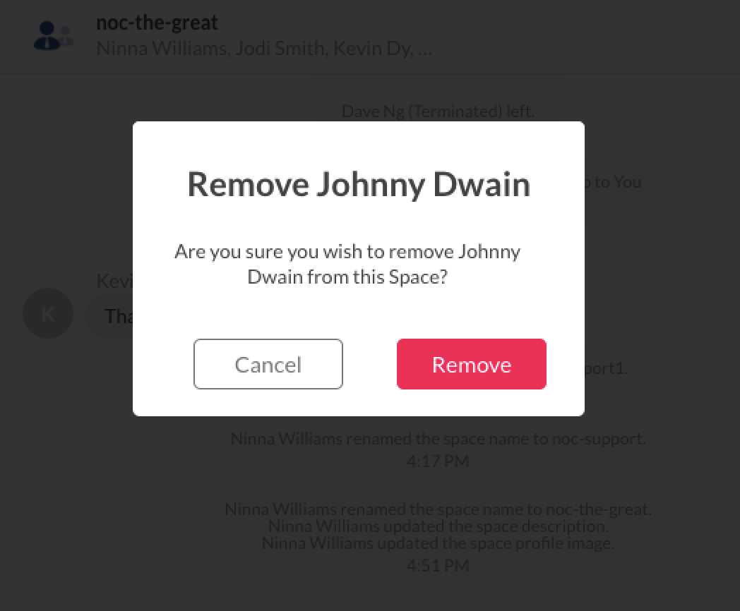 A notification will appear for the successfully removed members, and their names will be removed from the member list. The Space will also display a system message indicating the staff members have left.