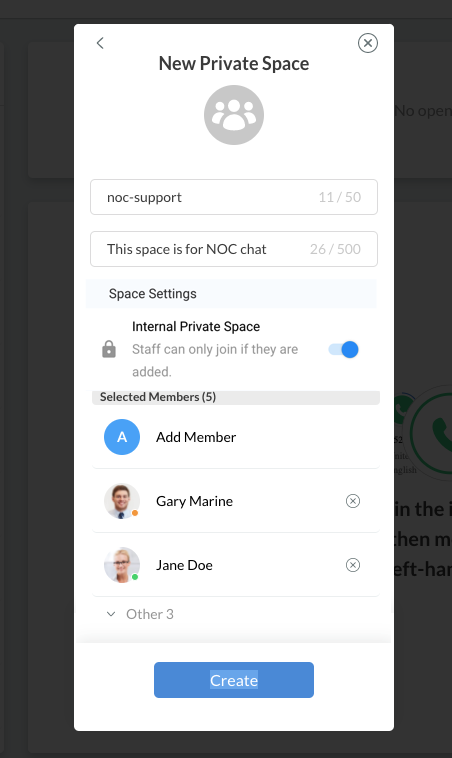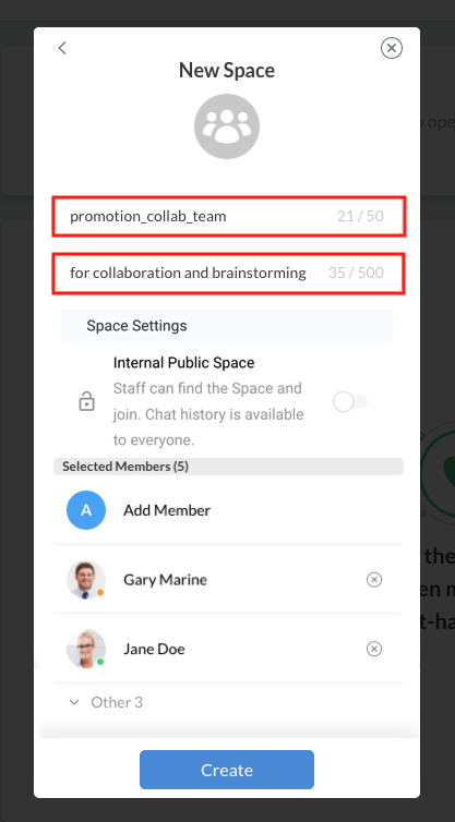 With Space, you can create an Internal Public Space, which is accessible and searchable by all staff members, or an Internal Private Space, which is invitation-only. Each Space can accommodate up to 500 staff members, making it ideal for both small teams and larger groups.