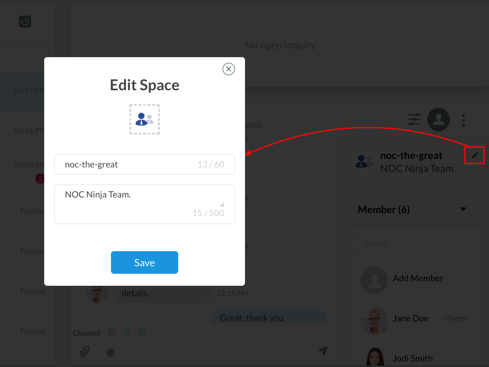 Changes in the name, description, and profile image will be reflected in the Space room information.
