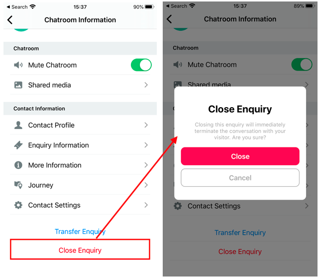 Tap Close. The enquiry's status will change from Ongoing or Followed-Up to Closed.
