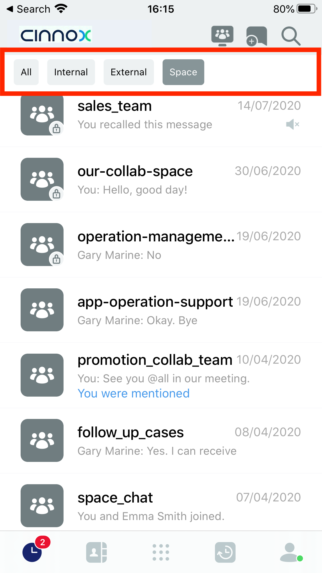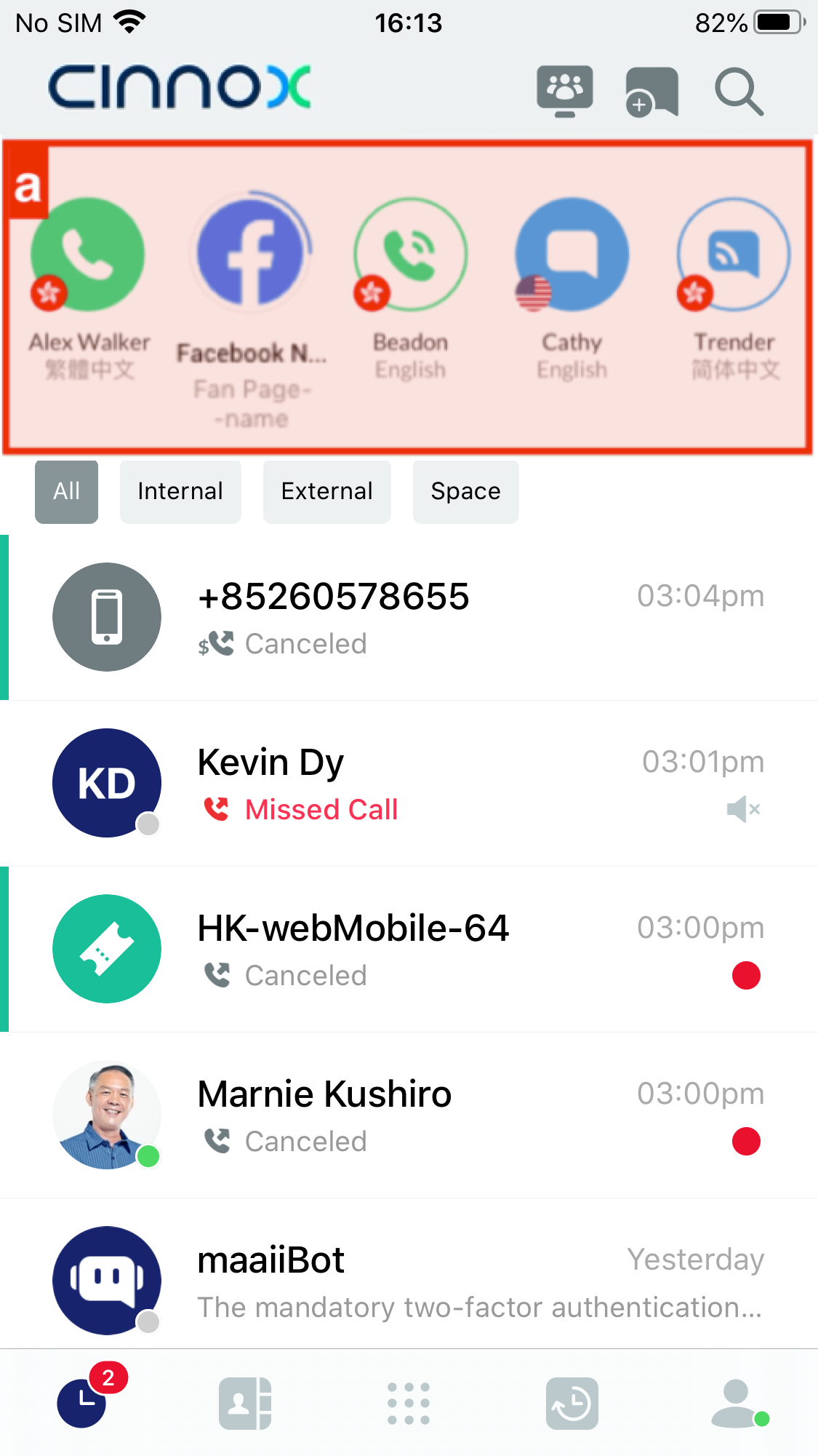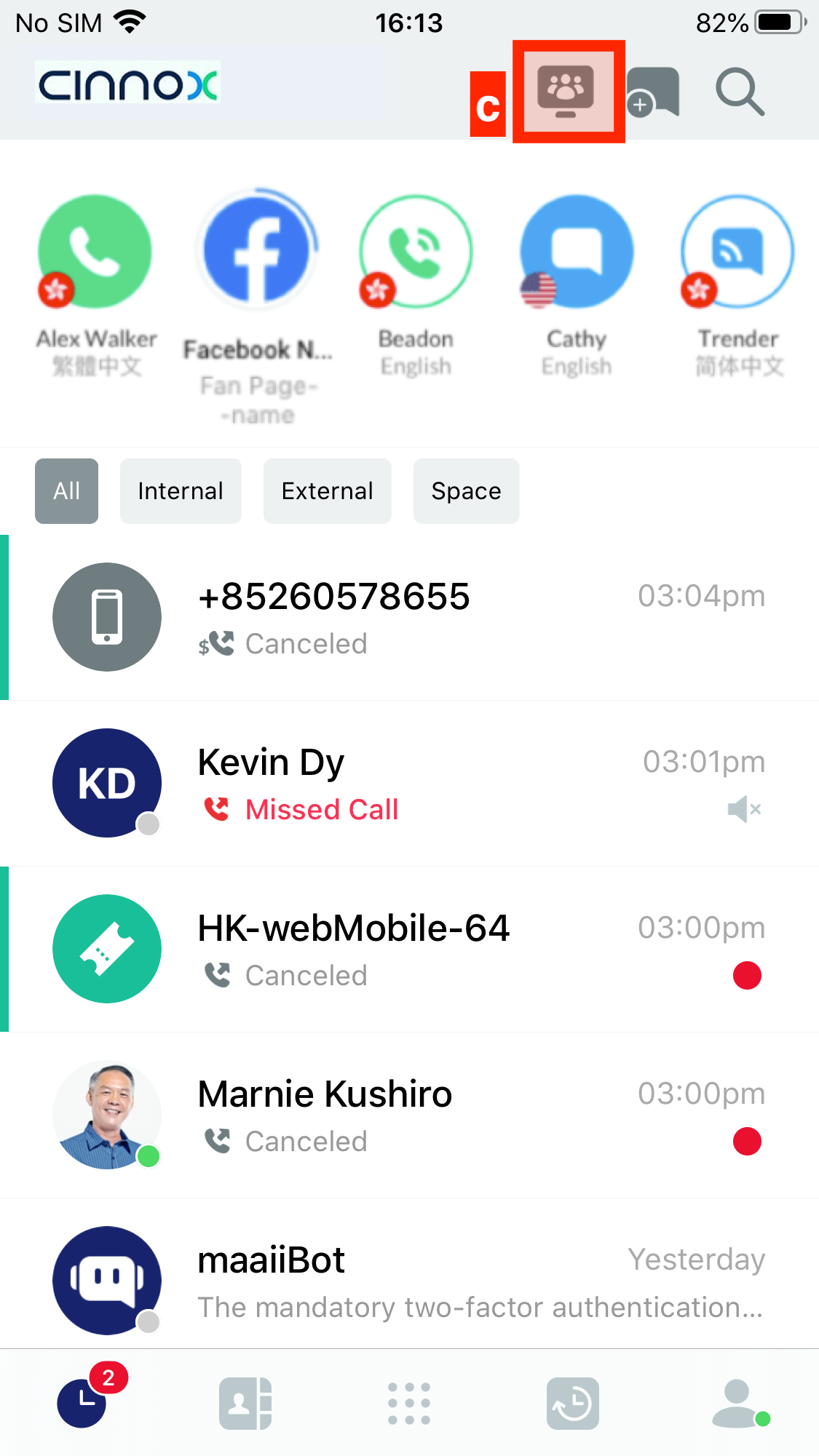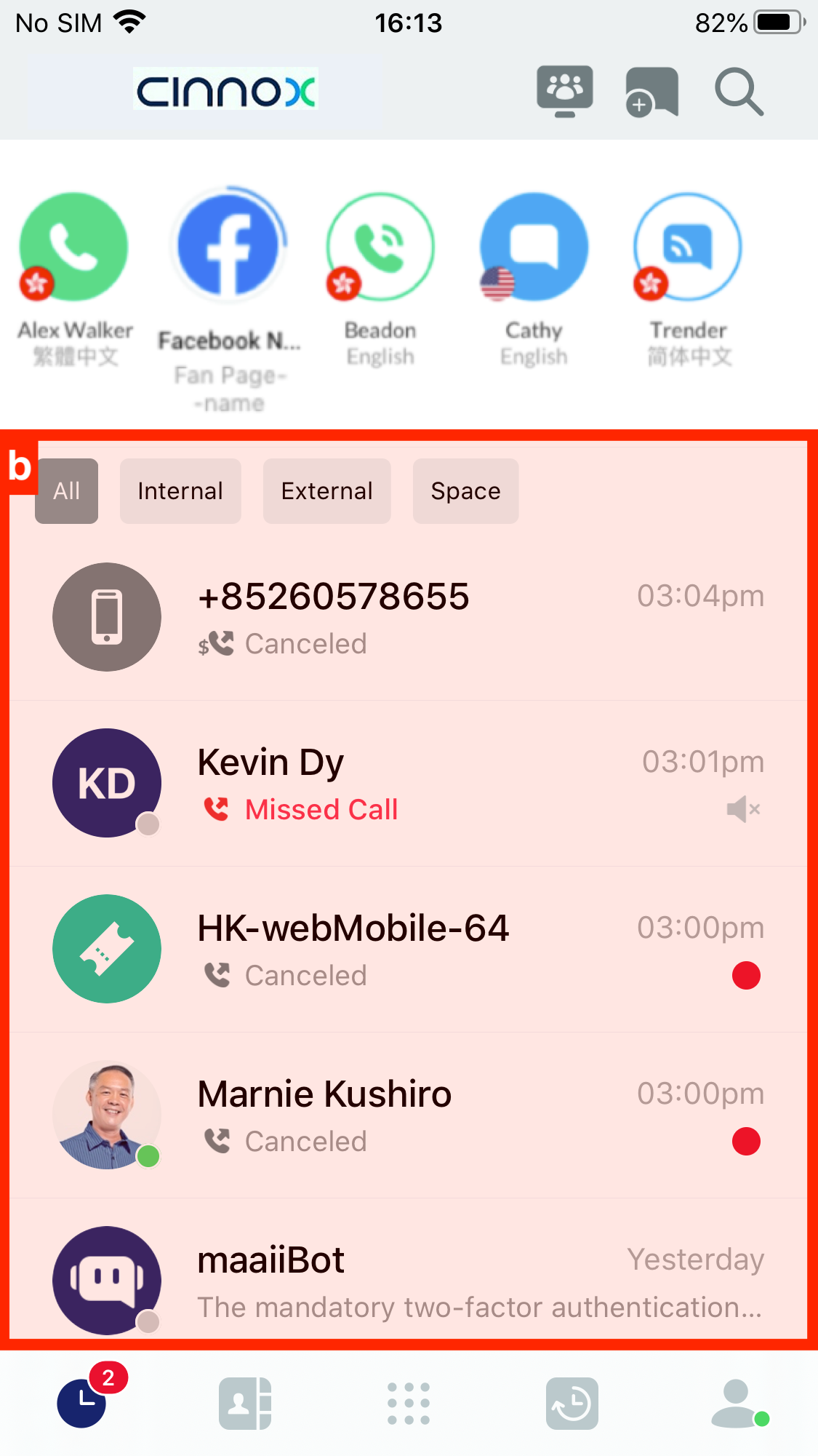 The Recent section (b) displays all the rooms where you have ongoing calls and chat conversations with customers, visitors, and fellow staff members.