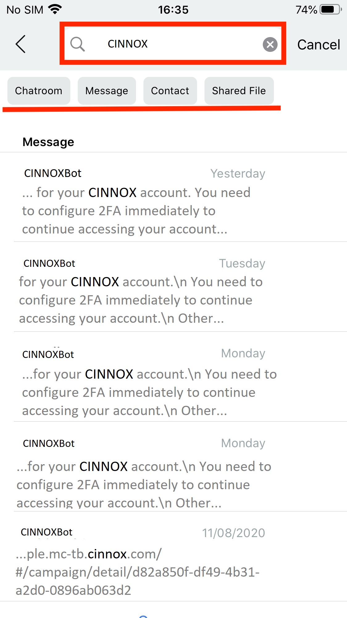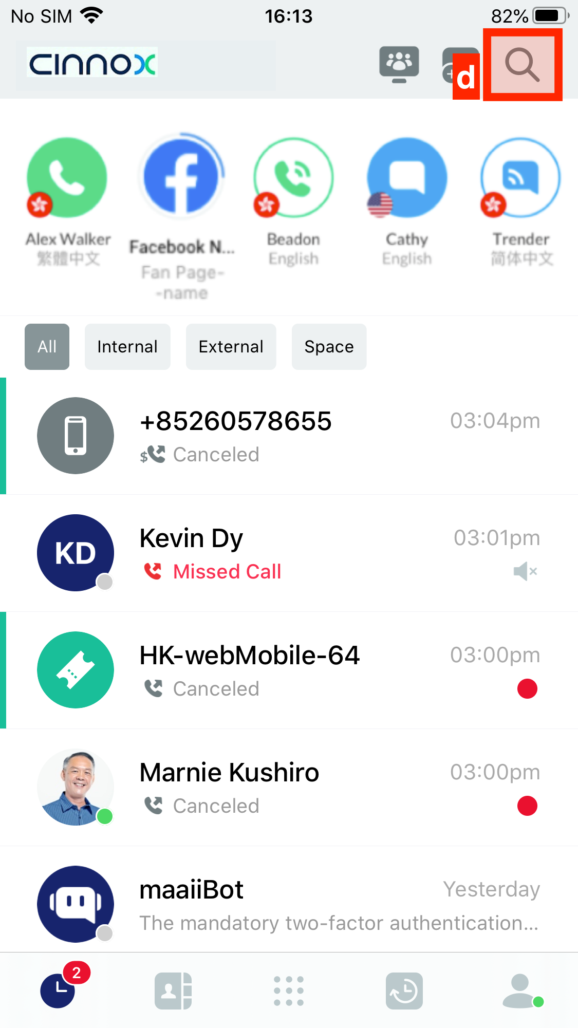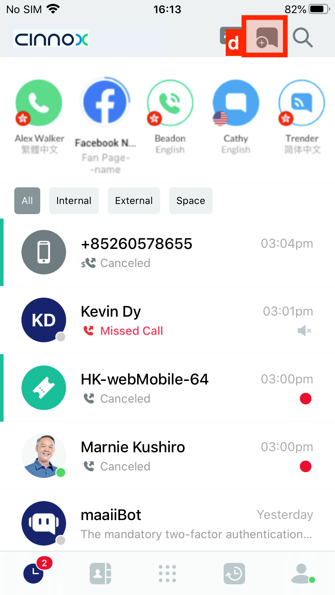 The New Chat function (d) lets you create a new 1-to-1 chat room or a new group Space for internal conversations with fellow staff members. For more information, refer to the Space for Internal Group Chat section of this Guide.