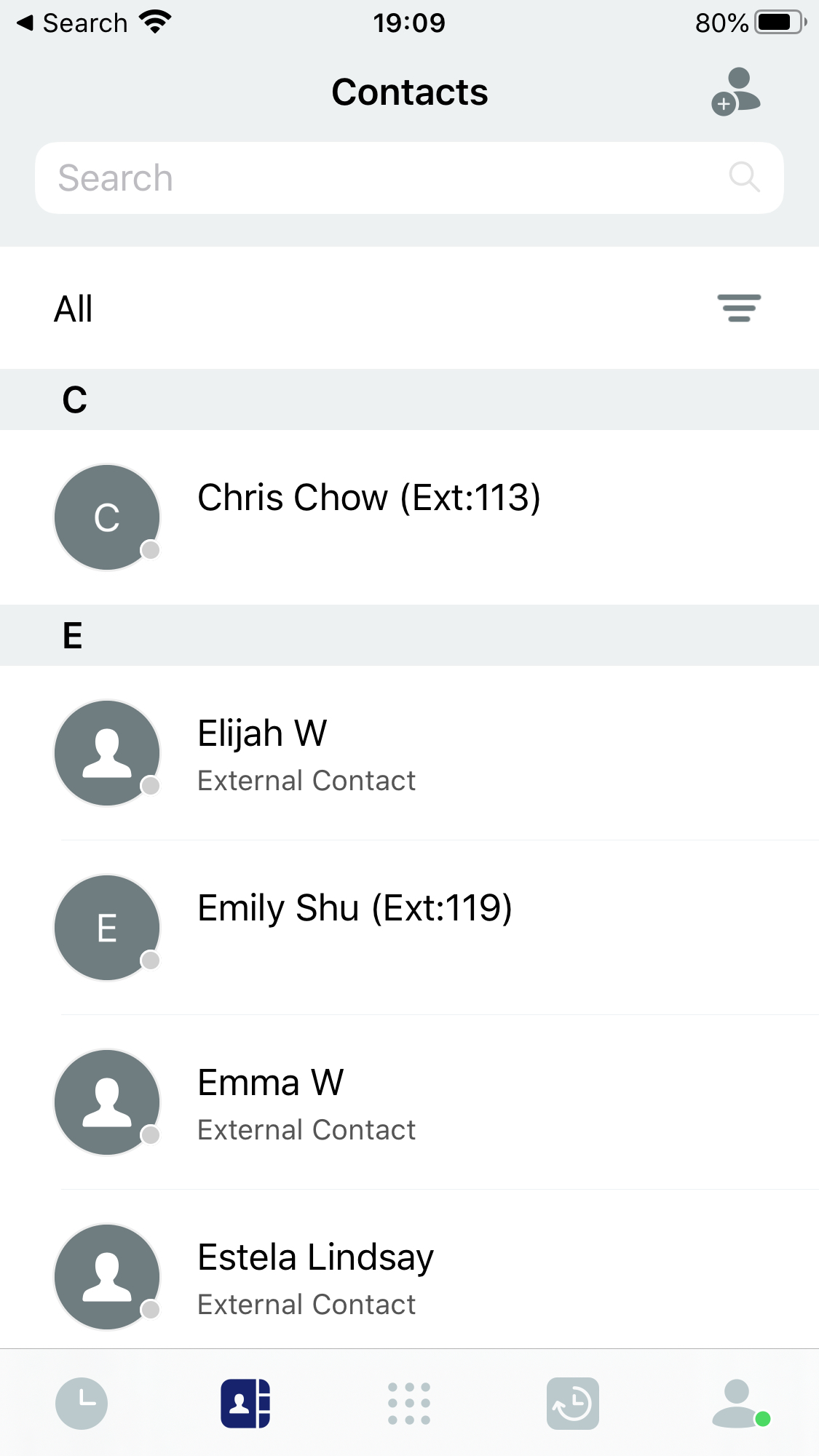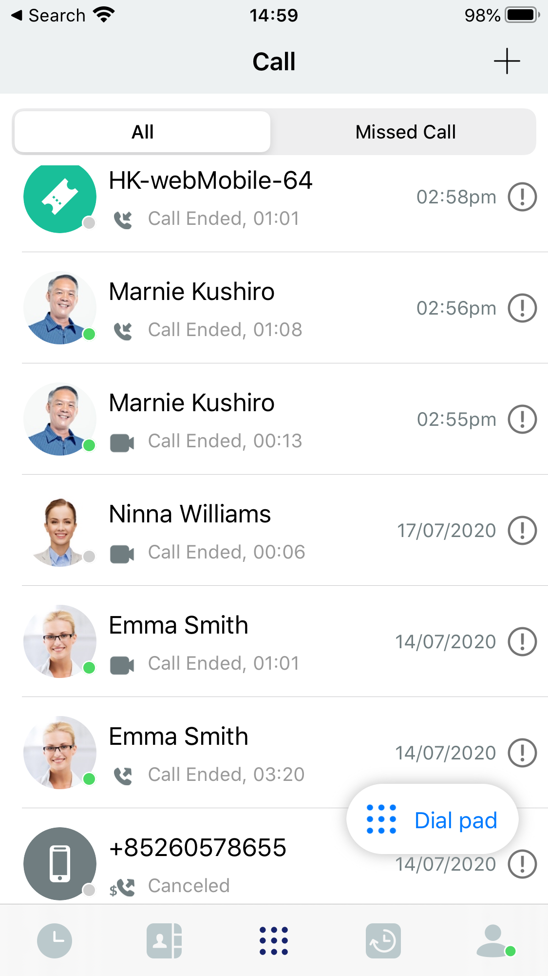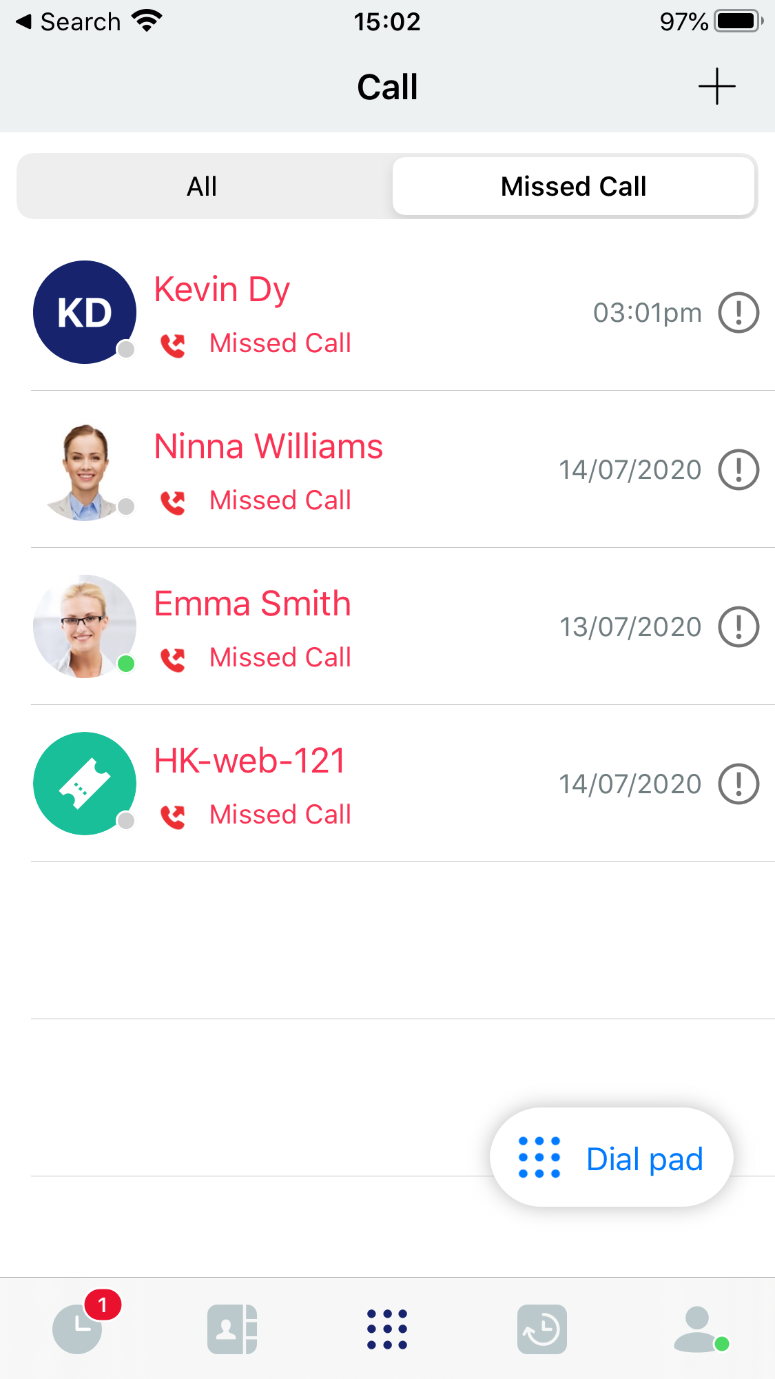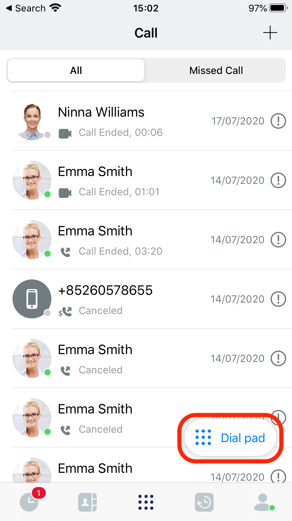 The dial pad feature opens a full-scale keypad that lets you dial a phone number or search for your external contacts' phone numbers and dial them.