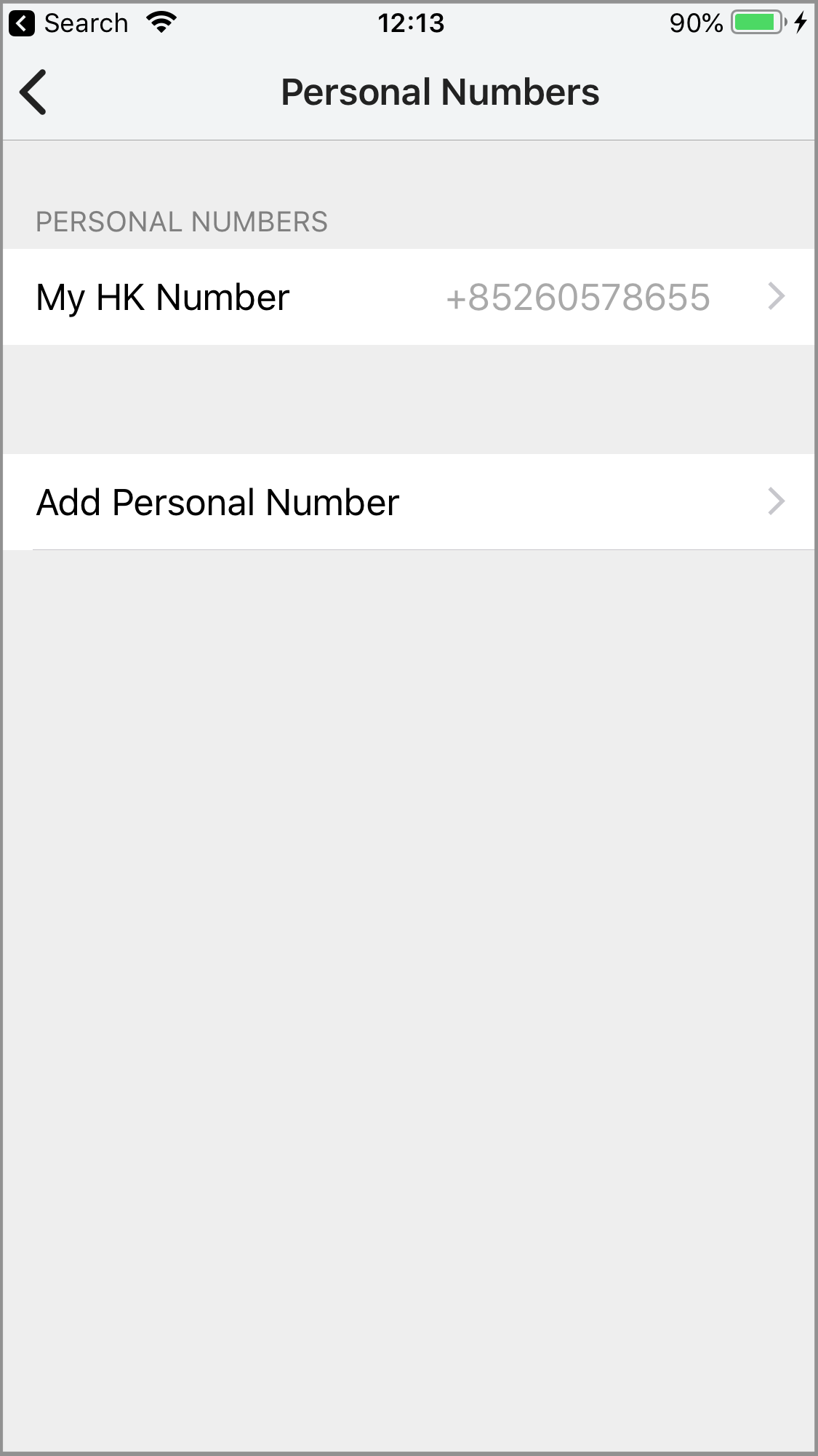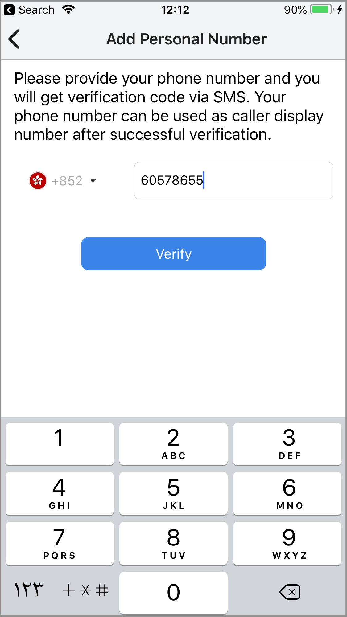 On the Add Personal Number screen that will appear, select the country code from the dropdown list, type in the phone number you want to add using the keypad, and then tap Verify. An SMS verification code will be sent to the phone number you added.