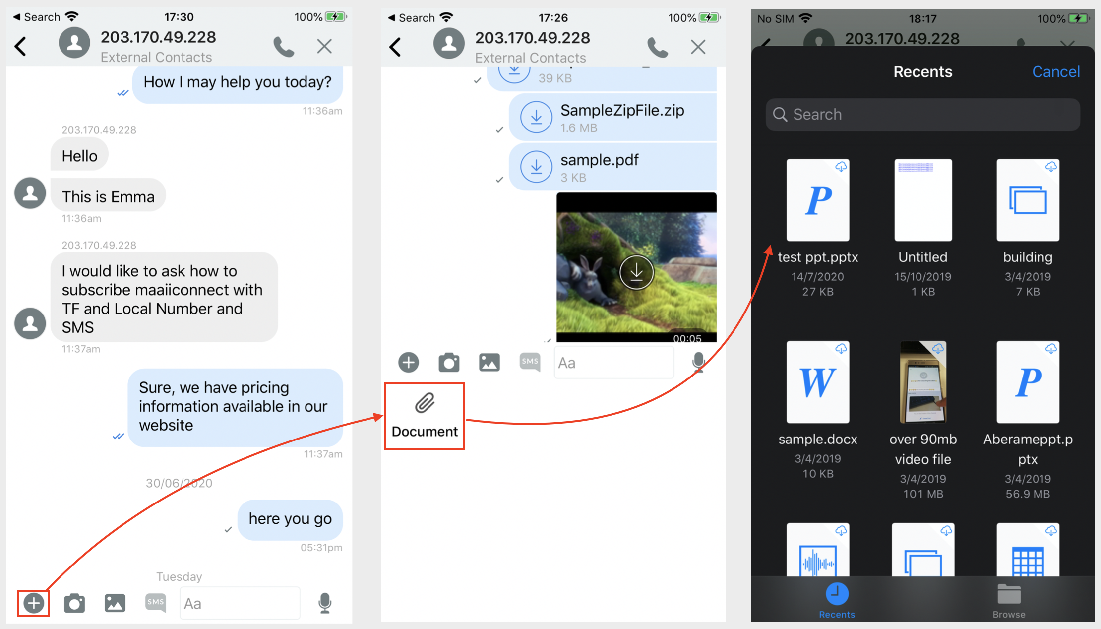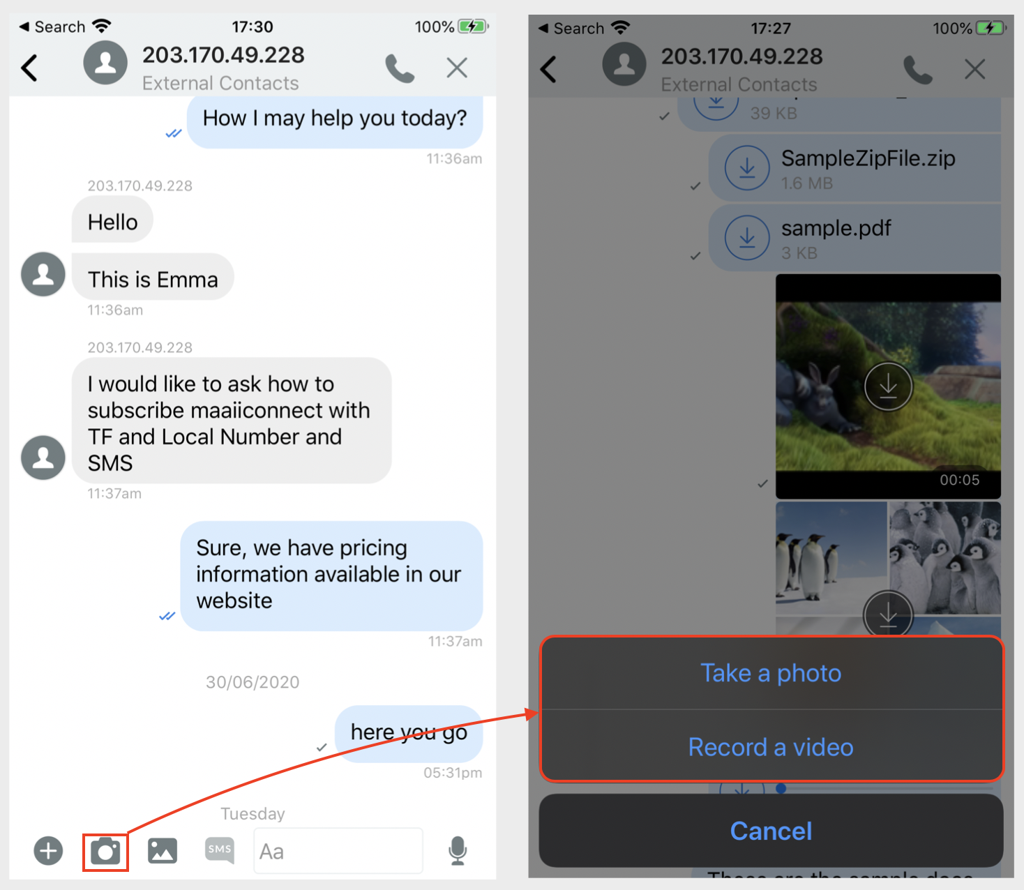 Staff members can share files up to 20 MB from their local device using the CINNOX App.