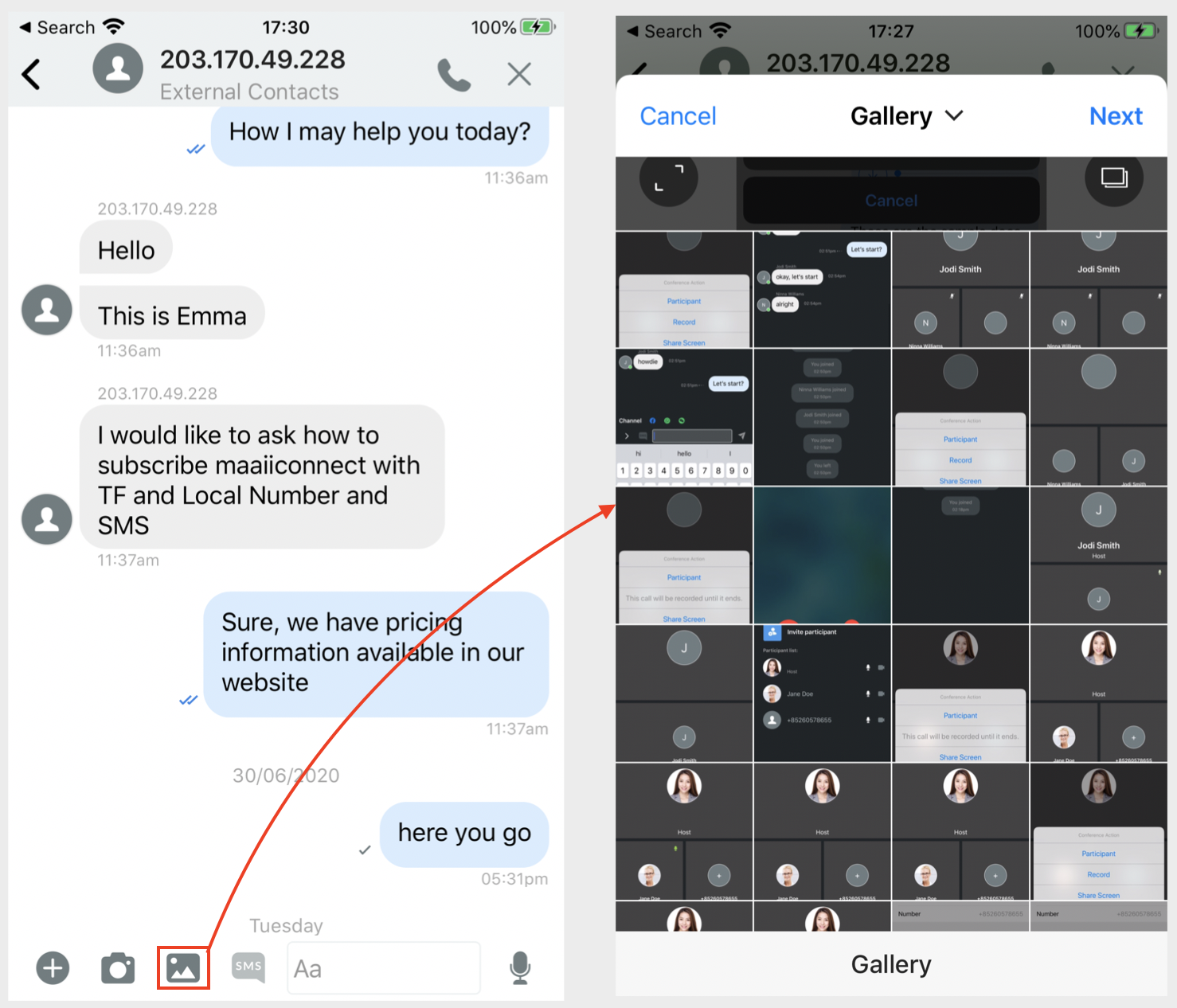 On the chatroom screen, tap the Gallery icon on the left side of the input text bar to access your image gallery or photo album.