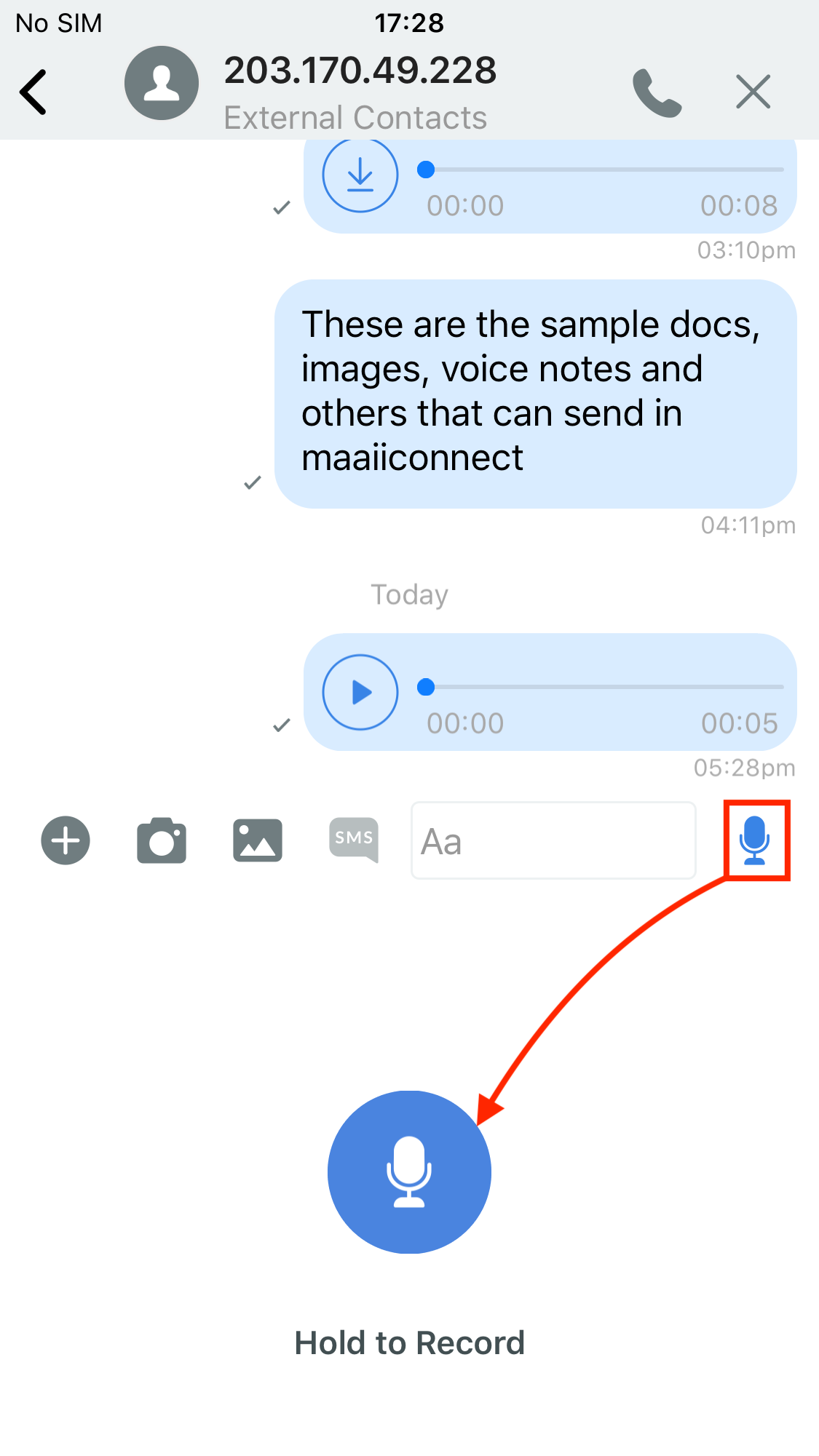 On the chatroom screen, tap the Microphone icon on the right side of the input text bar.