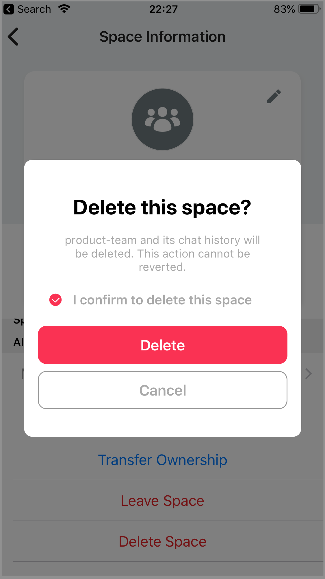 A. As a Space owner, you can delete your Internal Private/Public Space.