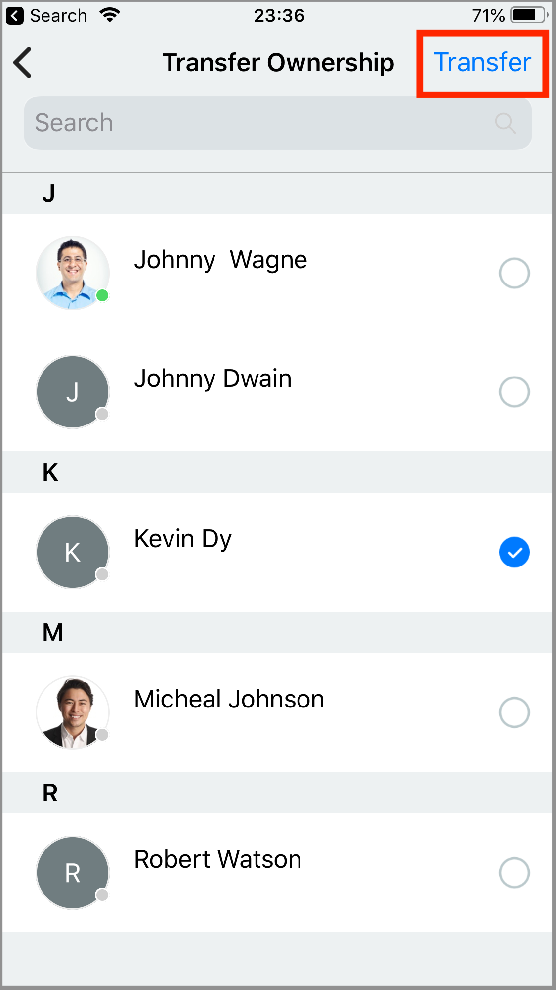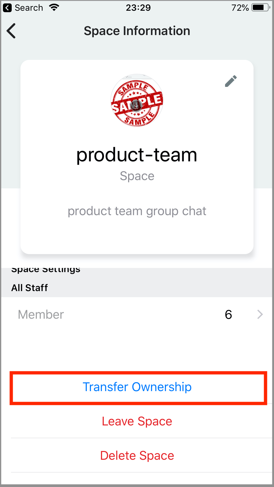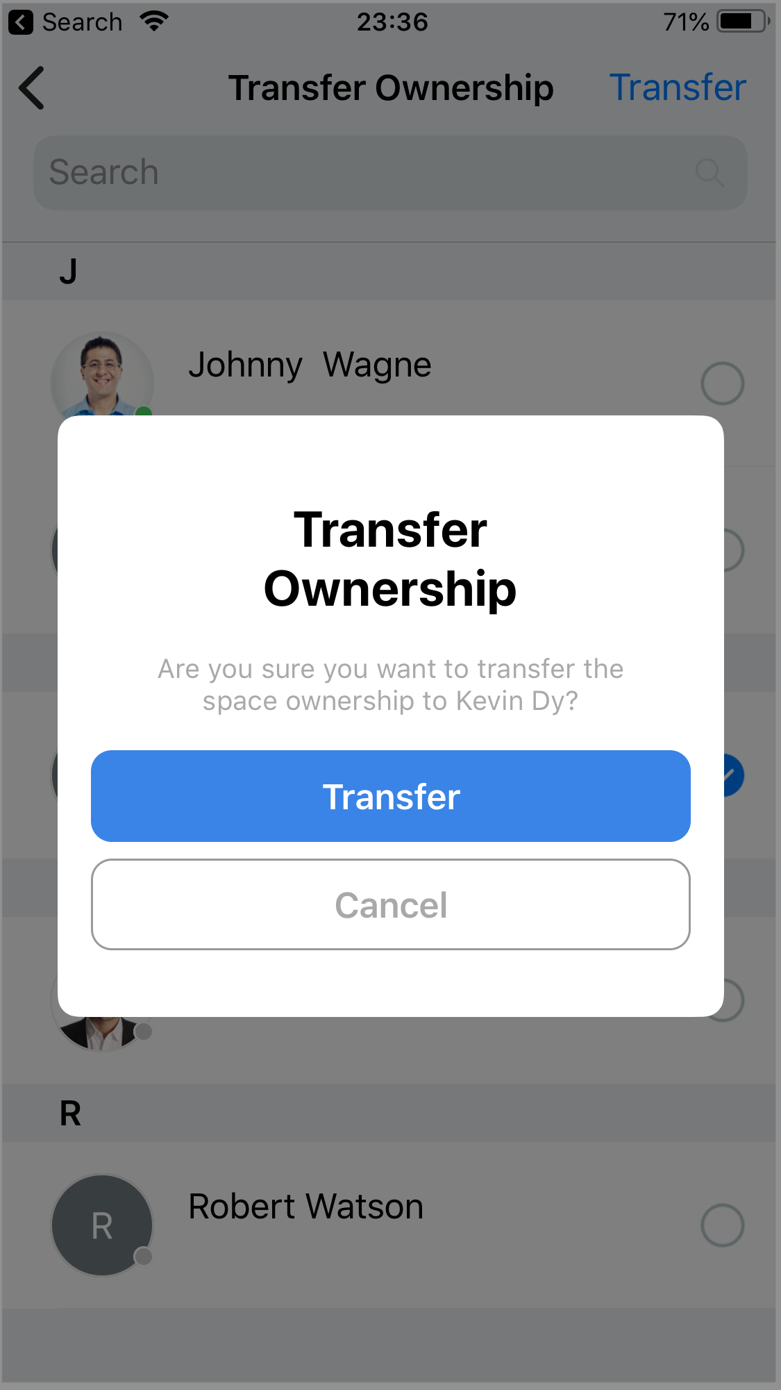 The Space will then display a system message indicating that the Space ownership has been transferred to another Staff member.