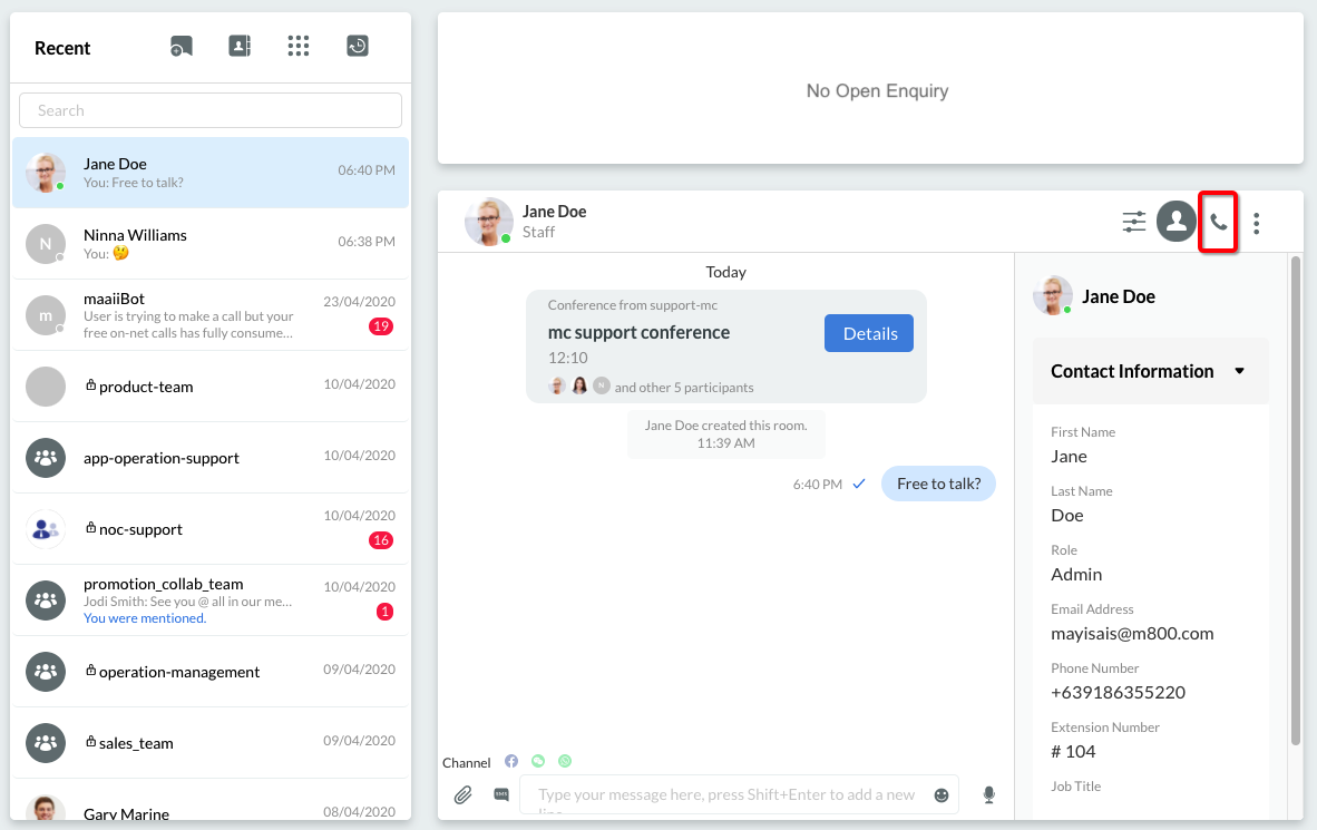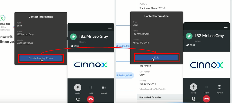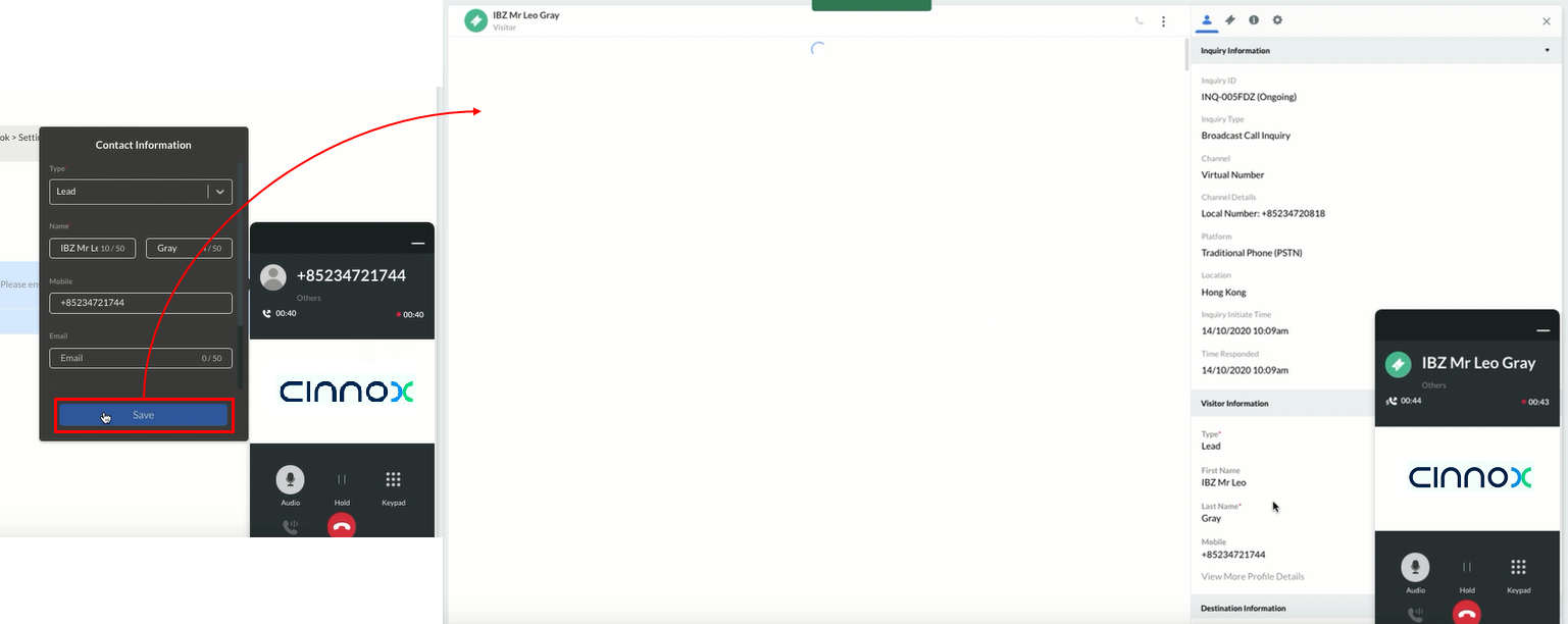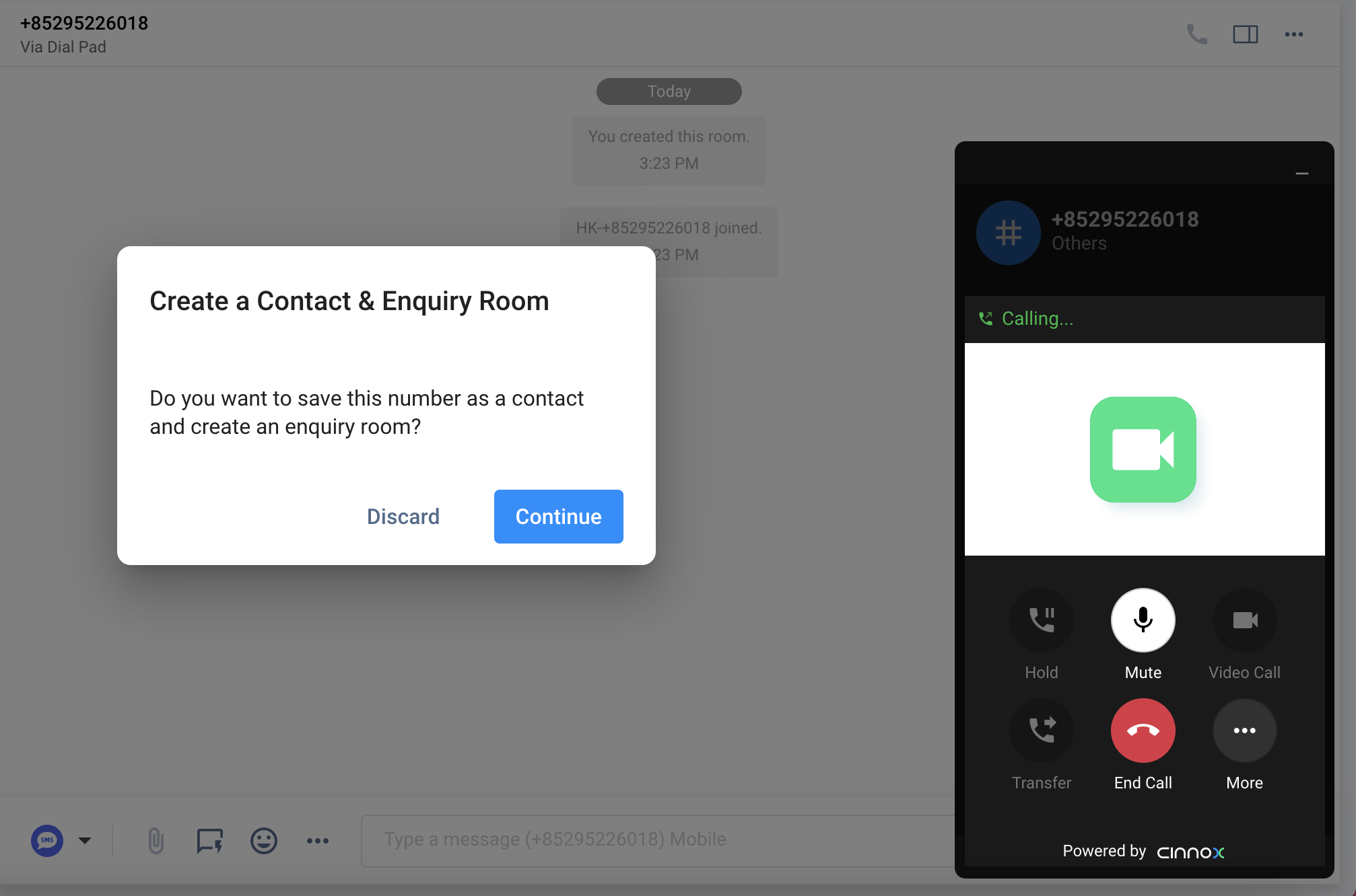 When a staff member calls a phone number in Engagement mode, they can save the called party's contact details and create an enquiry room, provided the staff has permission to create external contact.