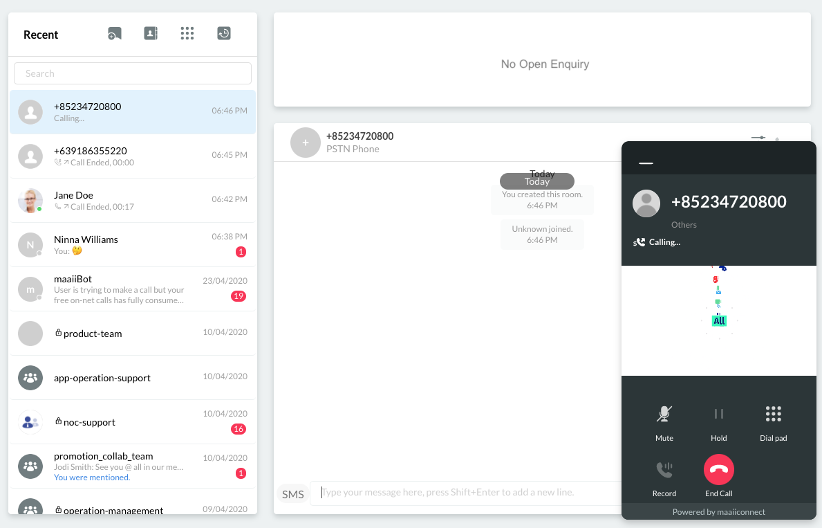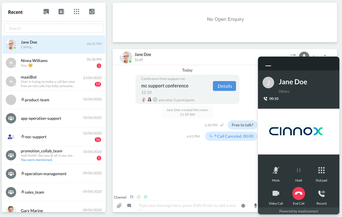 Whenever you or anyone else makes or answers a call on CINNOX, it logs a call history into the room.