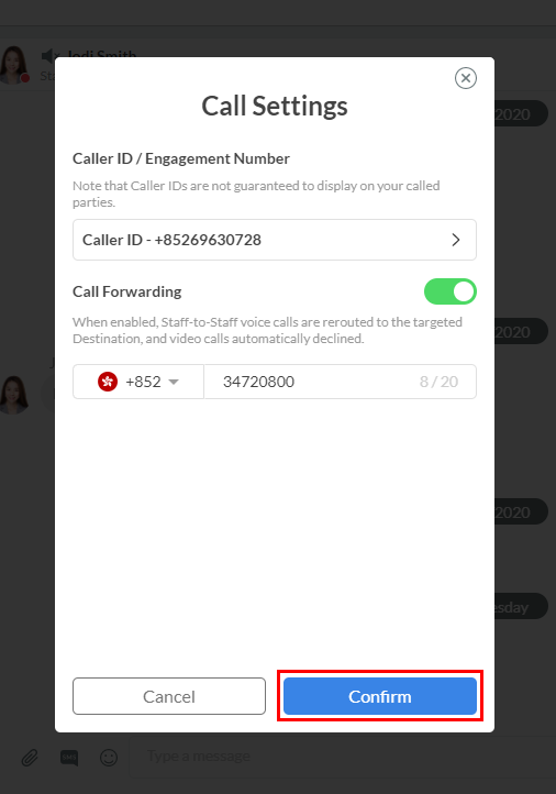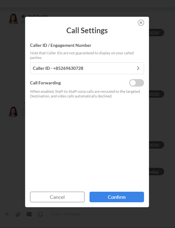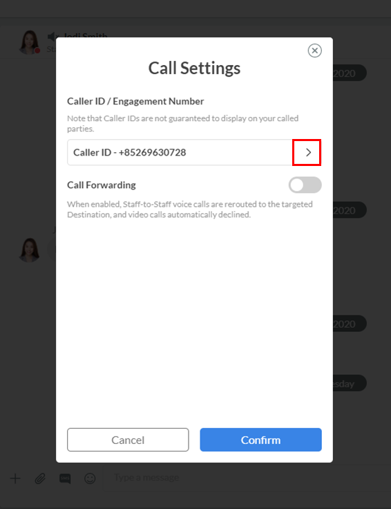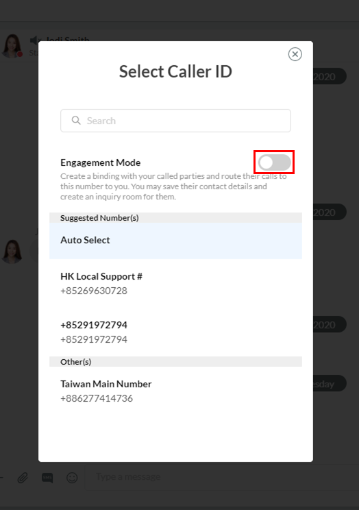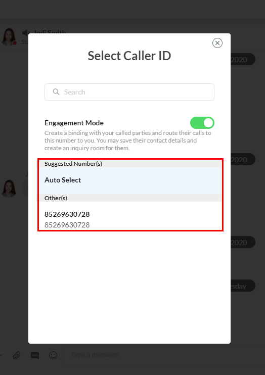 When making outbound calls to customers or visitors, staff members can set the virtual phone number they use as their Caller ID in Engagement mode.