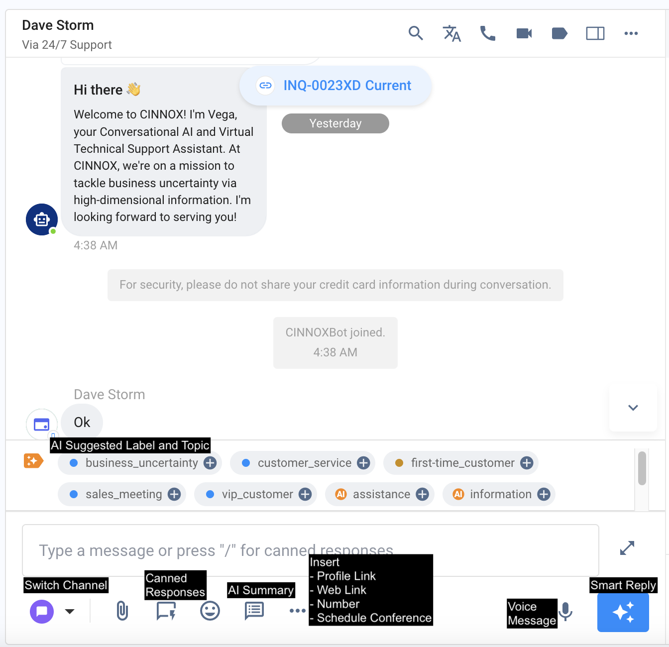 The panel in the CINNOX Workspace where staff members can send/receive instant messages and share files such as images, videos, documents, voice messages, or SMS texts to their customers or colleagues.
