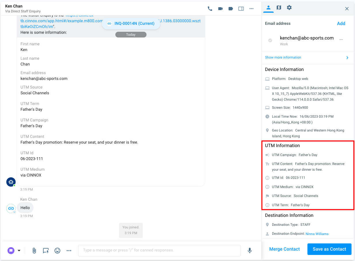 Please note that UTM Information supports enquiries from Weblinks of Direct Chat and Call Enquiry provided by staff agents. However, it does not support Weblinks from Social channels.
