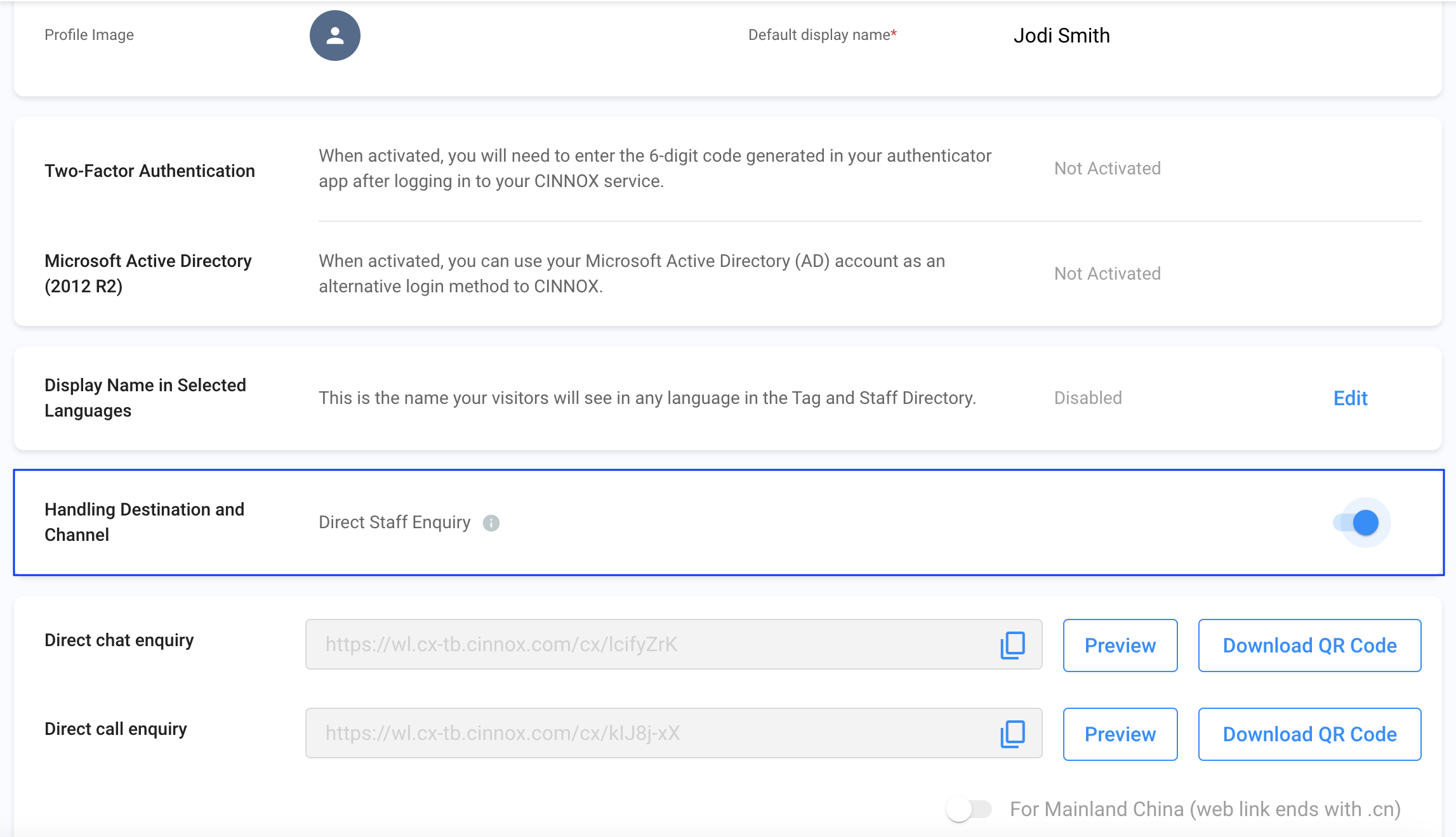 Open the Staff Account Details of the staff member, then find Handling Destination and Channel > Direct Staff Enquiry and toggle the button ON.