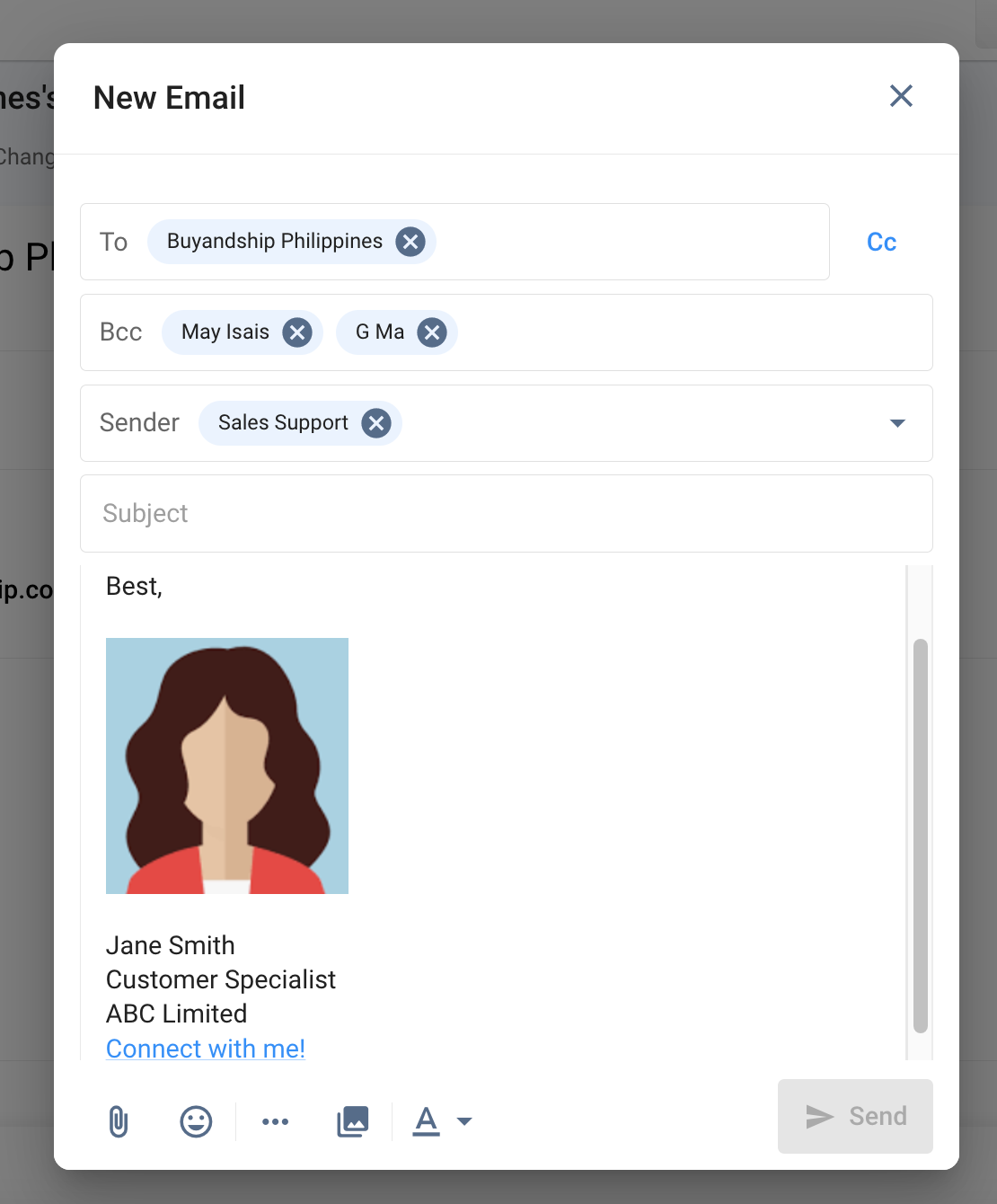 When you set up your Email Signature on your Dashboard My Account > Profile, the email signature will be attached to your new or reply email window.