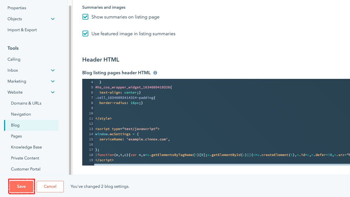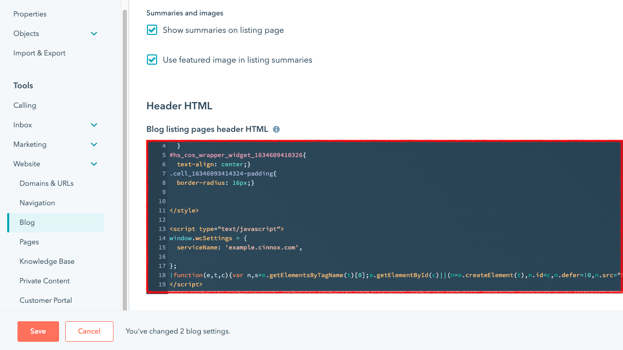 Here are the steps to follow when adding the CINNOX web widget on your Hubspot Blog or Pages:
