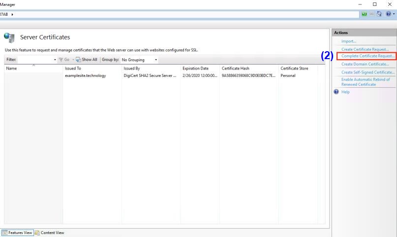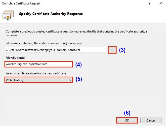 | * *File name containing the certificate authority's response:** | Click the … box and browse to and select the .cer file (3) (e.g., your_domain_com.cer) that DigiCert sent to you. |