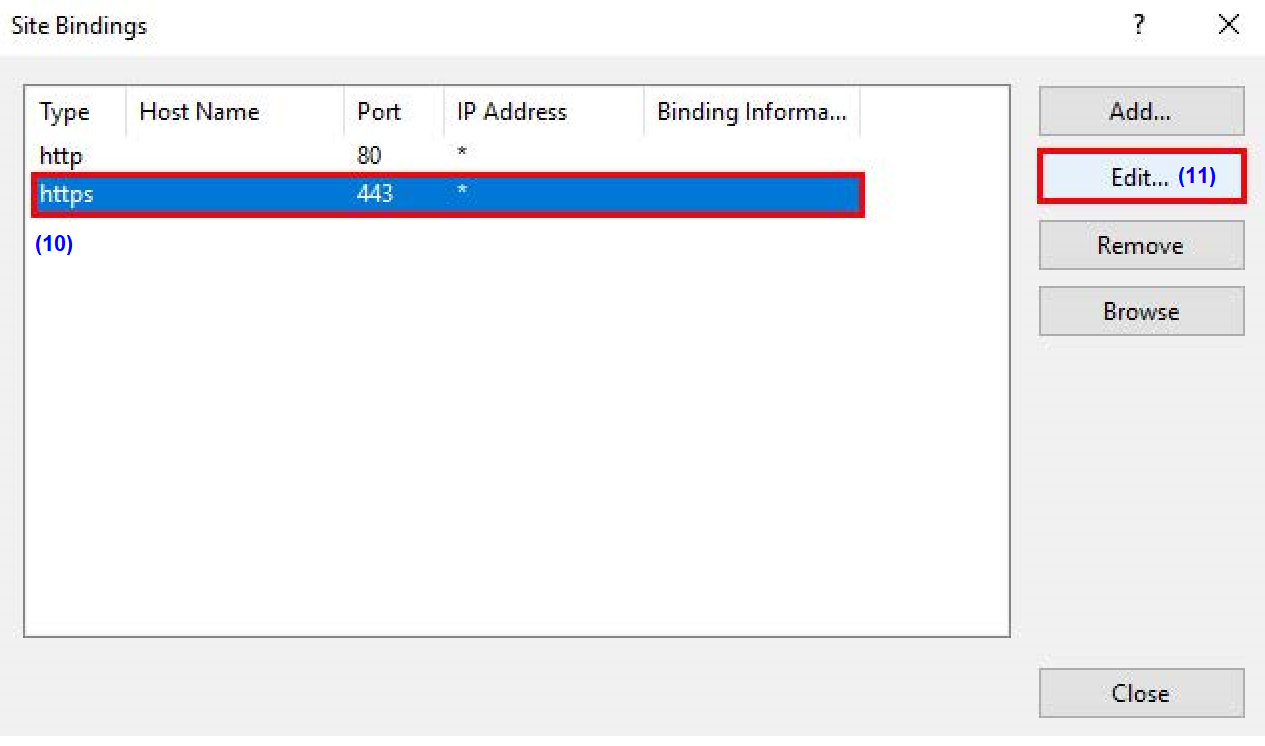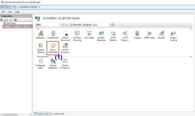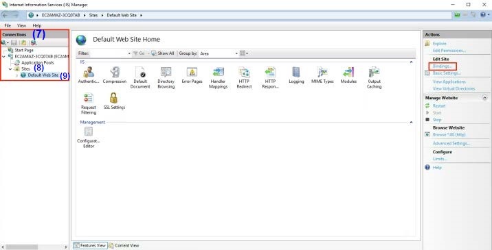 In the Internet Information Services (IIS) Manager, in the Connections (7) menu tree (left pane), expand the name of the server on which the certificate was installed. Then expand Sites (8) and click the site (9) you want to use the SSL certificate to secure.