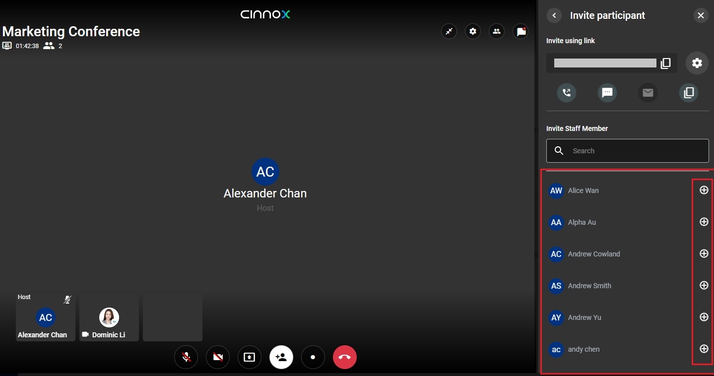 Click the (+) icon beside the staff member's name. The CINNOX Dashboard and App will notify the staff member of the invitation for the conference call. Once they accept, CINNOX will add them as a participant in the conference.