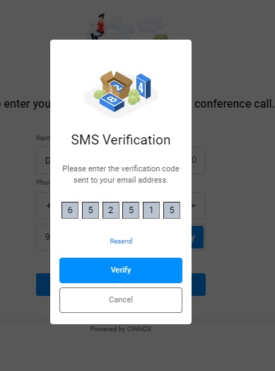 If the conference host has enabled phone verification, type the SMS verification code sent to your phone number, and click Verify. A pop-up confirmation window will then appear if the verification is successful.