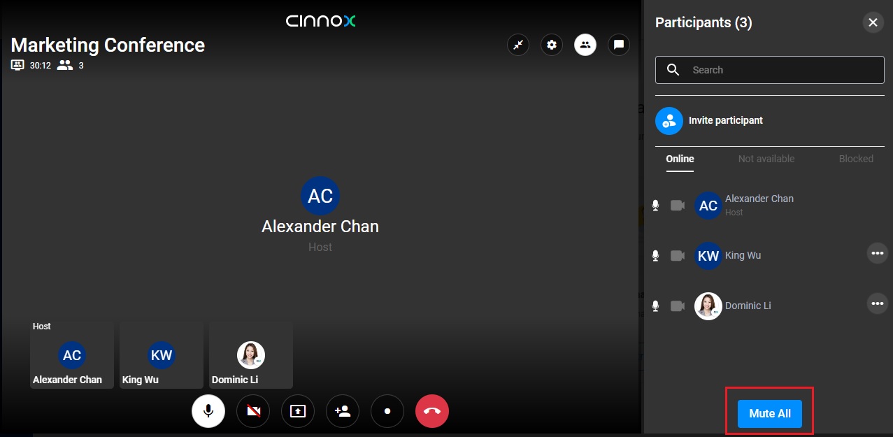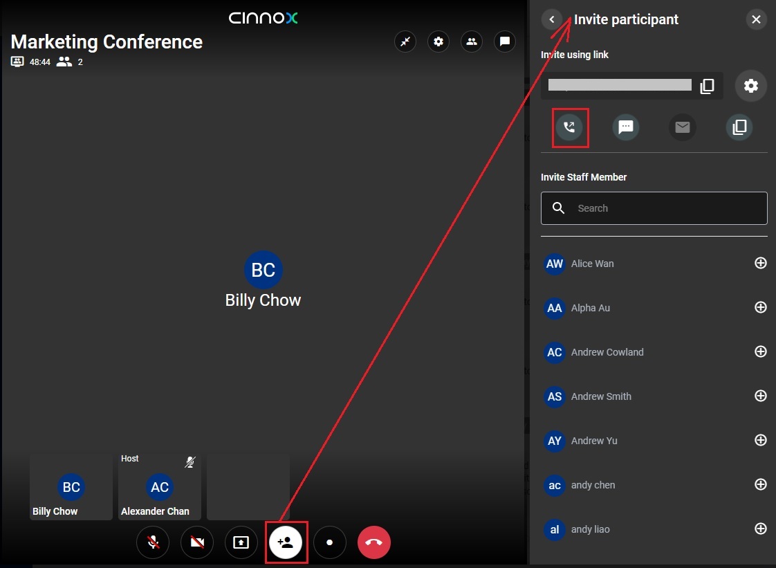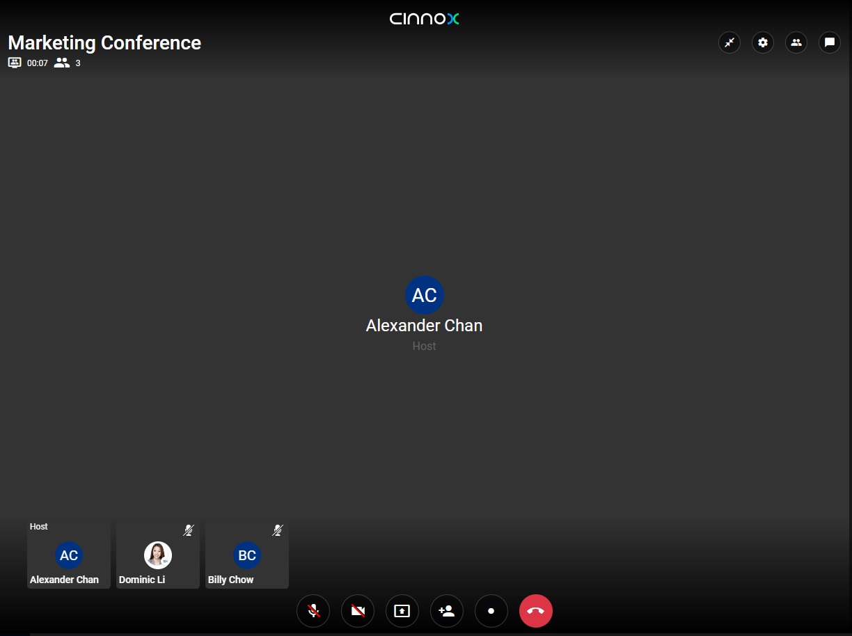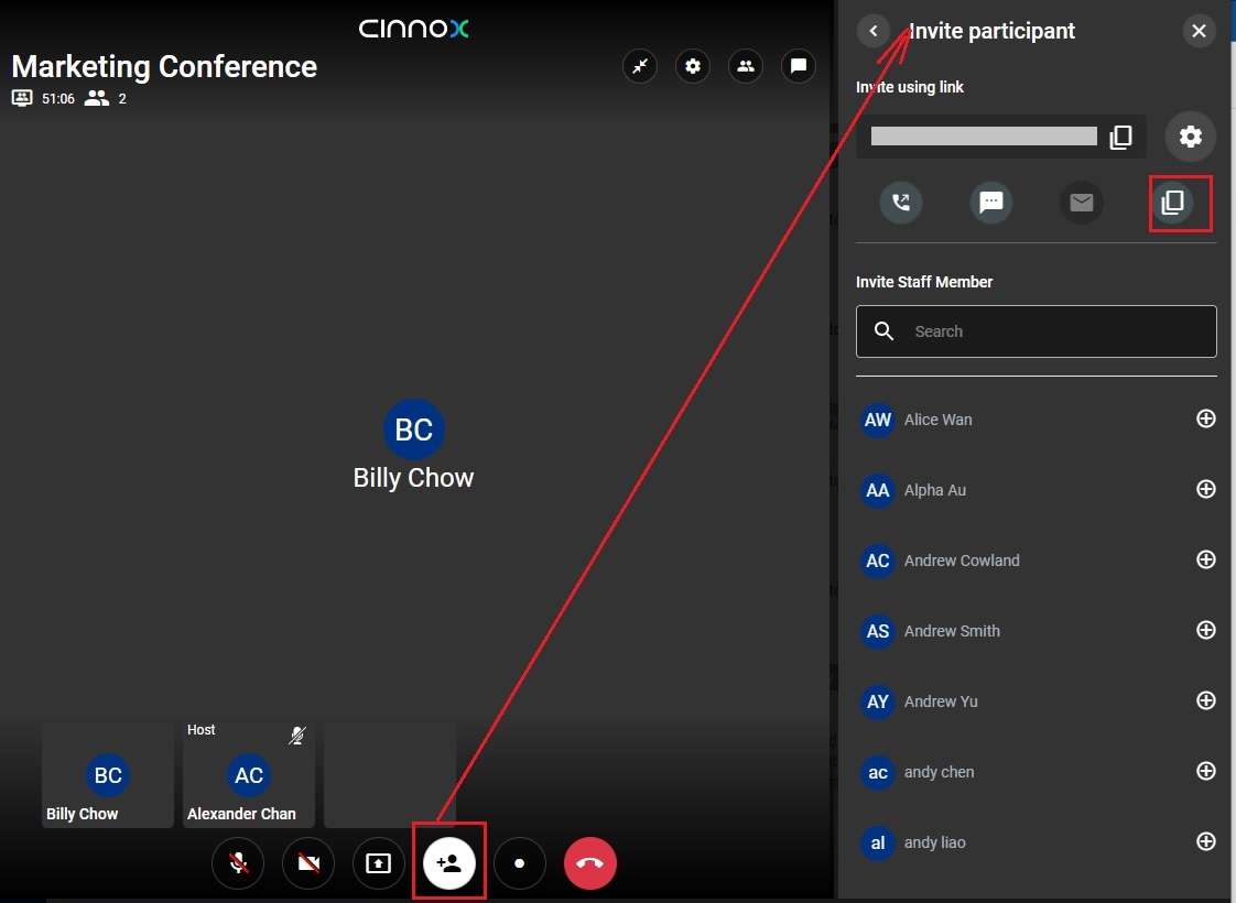 Once CINNOX launches the conference call room, you can invite other participants. Refer to the Inviting Participants section for more details.