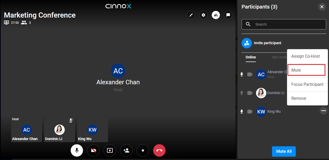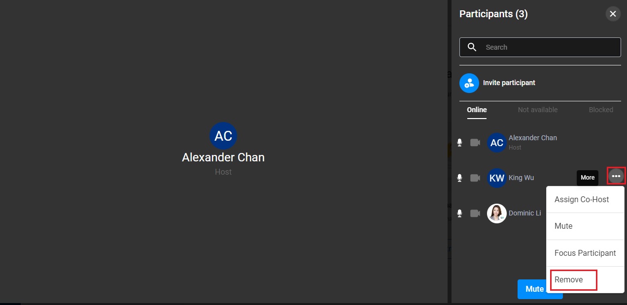 Click the Participant icon to view the participant list in the conference call room. Select the Online tab and select the participant you wish to remove from the conference call.
