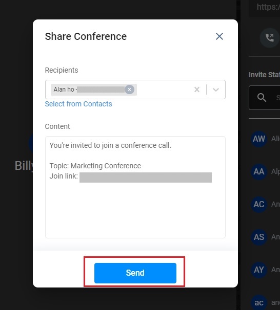 Click Confirm. Invited participants will receive the conference call invitation, and those who accept the invitation will be added to the conference.