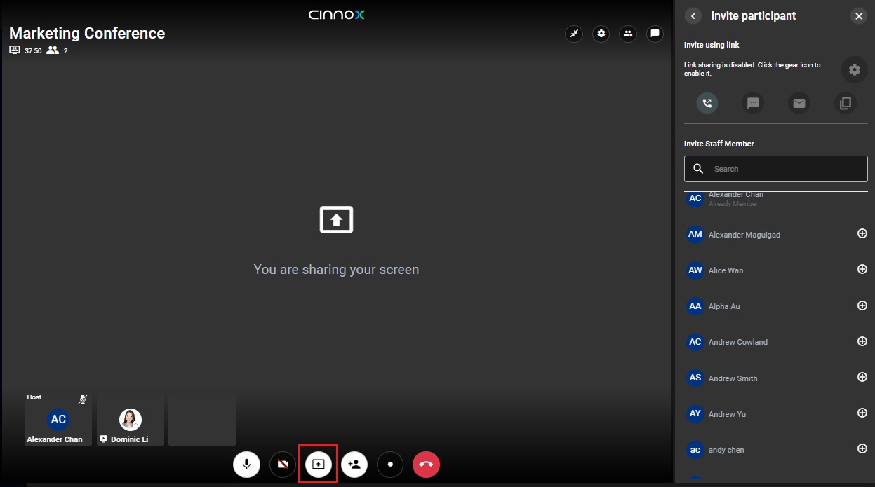 To stop sharing your screen, click the Share Screen button again. CINNOX will also automatically stop sharing your screen if another participant clicks on the Share Screen button from their end.