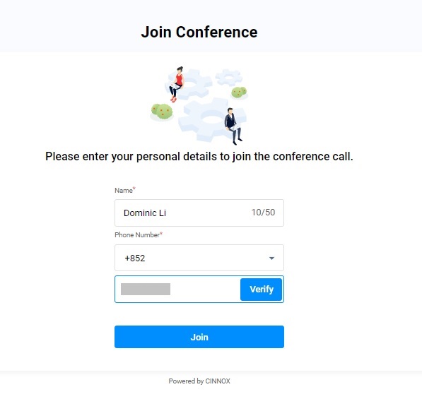Type your name and phone number on the Join Conference page displayed on your device browser, then click Verify.
