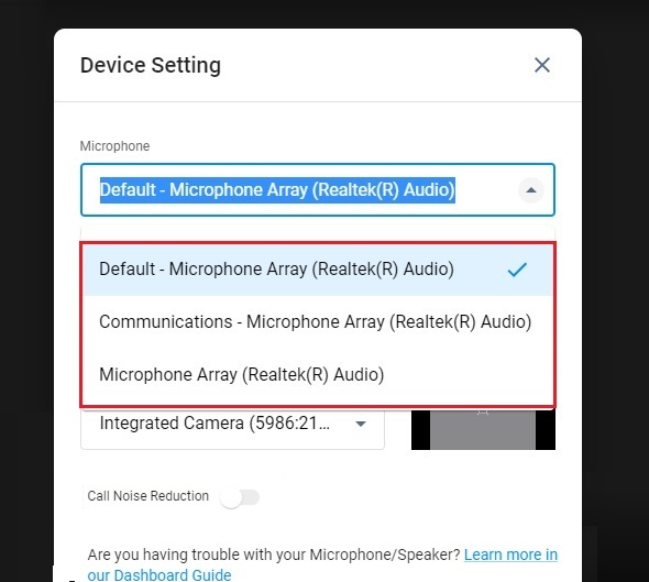Click the drop-down menu and select your microphone, speaker and camera for your use during the conference if required.