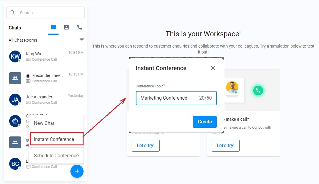 On the Utility panel of your Workspace, click on the (+) button, then click on Instant Conference.