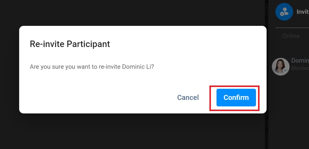 A pop-up message will appear with the following text: Are you sure you want to re-invite (Participant name)?
