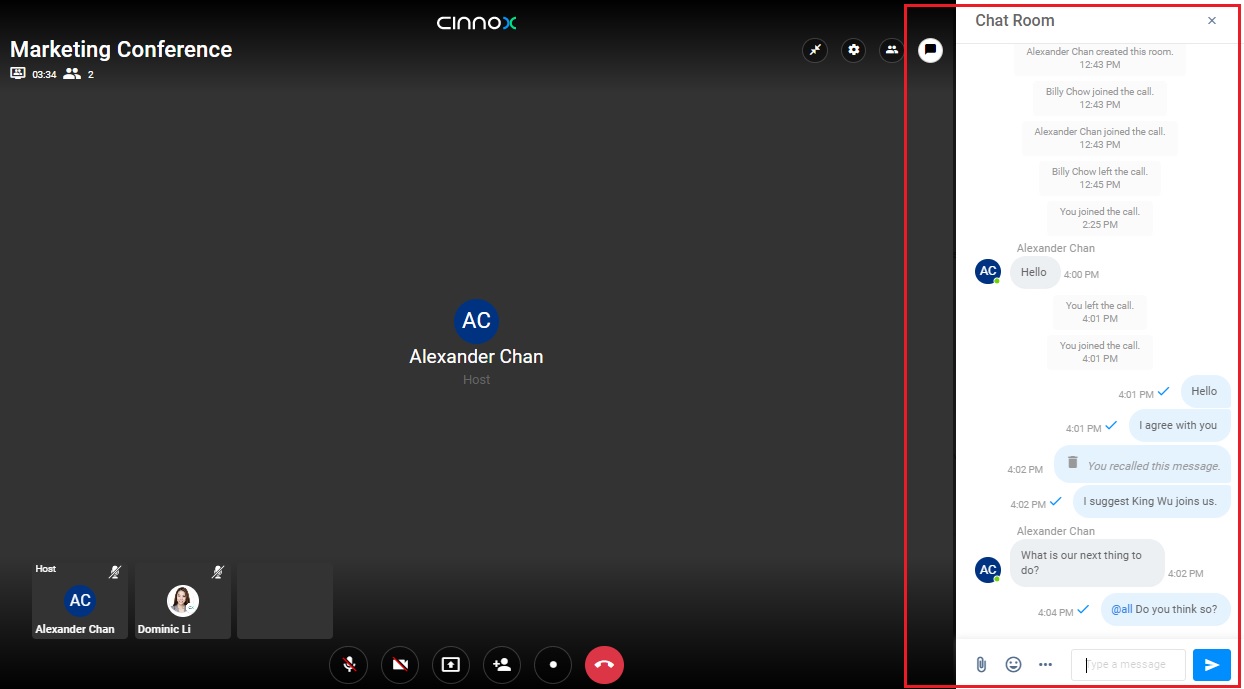 You can start sending messages on the chat input field or sending files using @mention on the expanded Chat room pane. All participants will receive your messages except those joining the conference using their phone numbers.