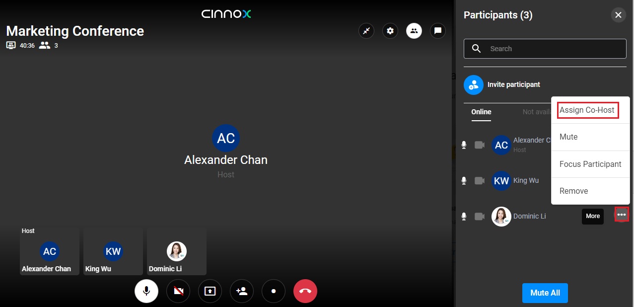 Click More(...) beside the participant's name, then click Assign Co-Host. Participants assigned as co-hosts will then have the same privileges as the host.