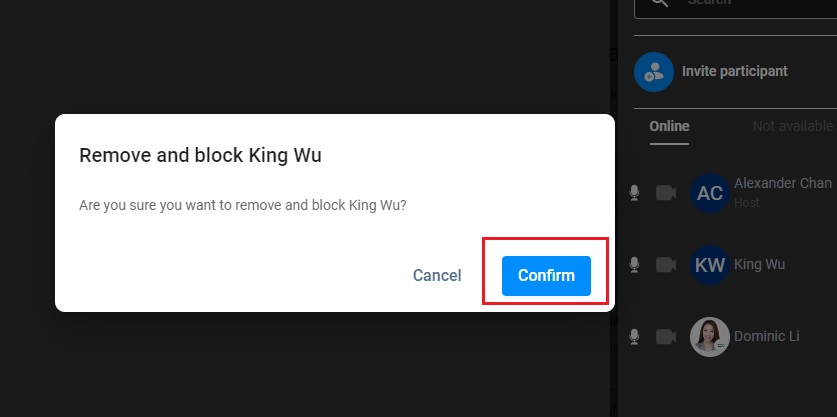 Click Confirm. The unblocked participant will be notified that they can rejoin the conference.
