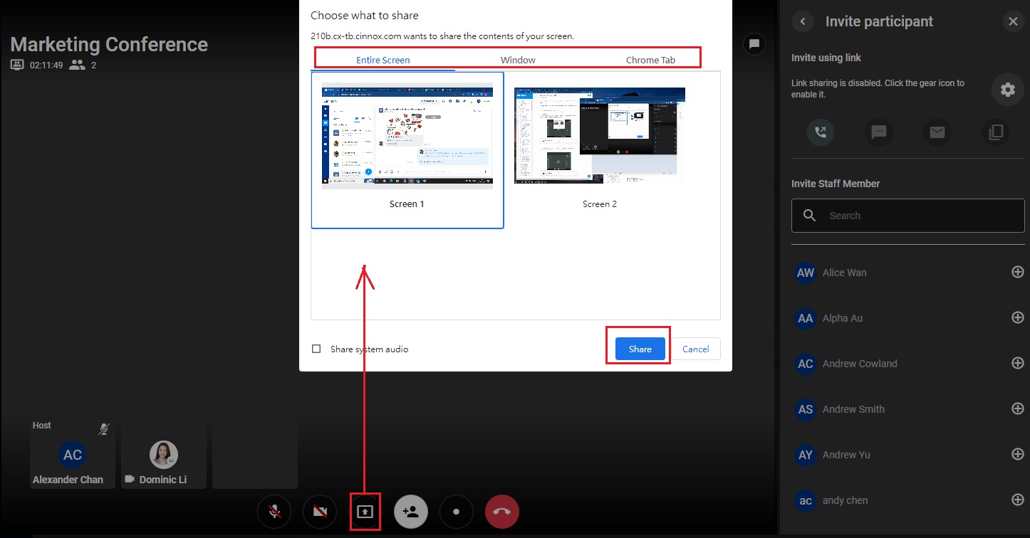 To share your screen, click the Share Screen button at the bottom of the conference call window. You can select an Entire Screen, a Window tab or a Chrome Tab to share.