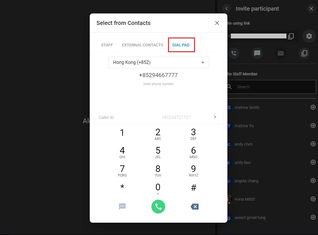Select the DIAL PAD tab on the pop-up window, type the country code phone number (e.g. +85294667777). You may also select a contact from your Staff Contact List, SALESFORCE Contact List or External Contacts.