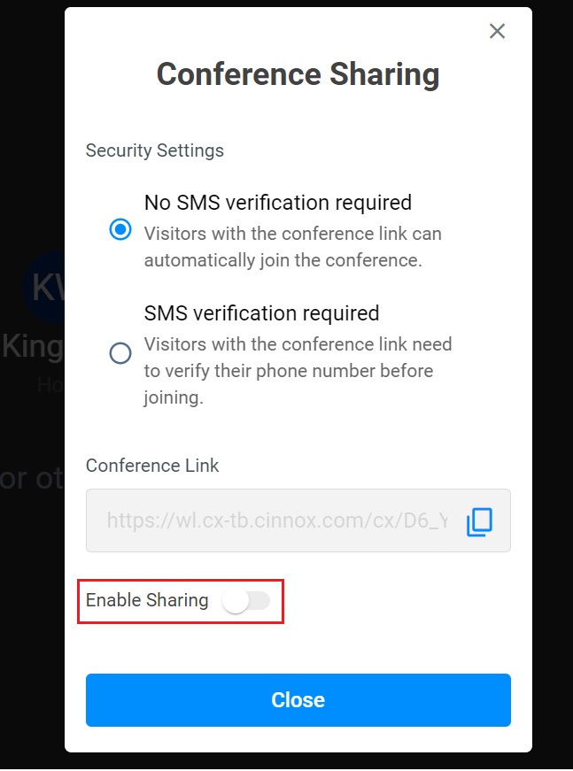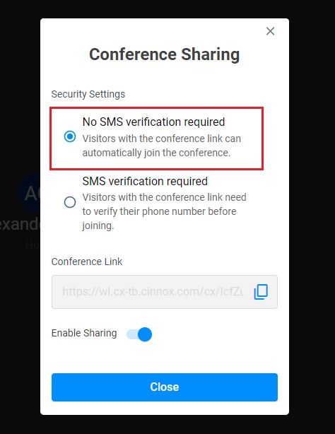 On the Conference Sharing pop-up window, switch the settings to no SMS verification required, if necessary.