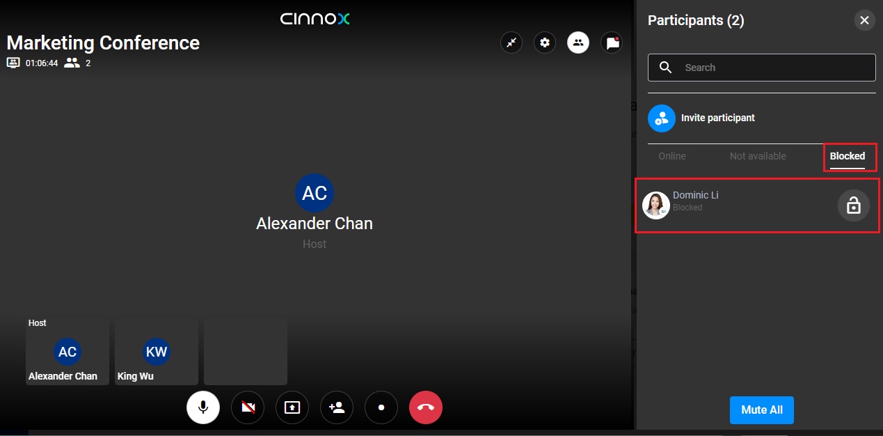 In the conference call room, click the Participant icon to view the participant list. Select the Blocked tab, and the blocked participants are listed.