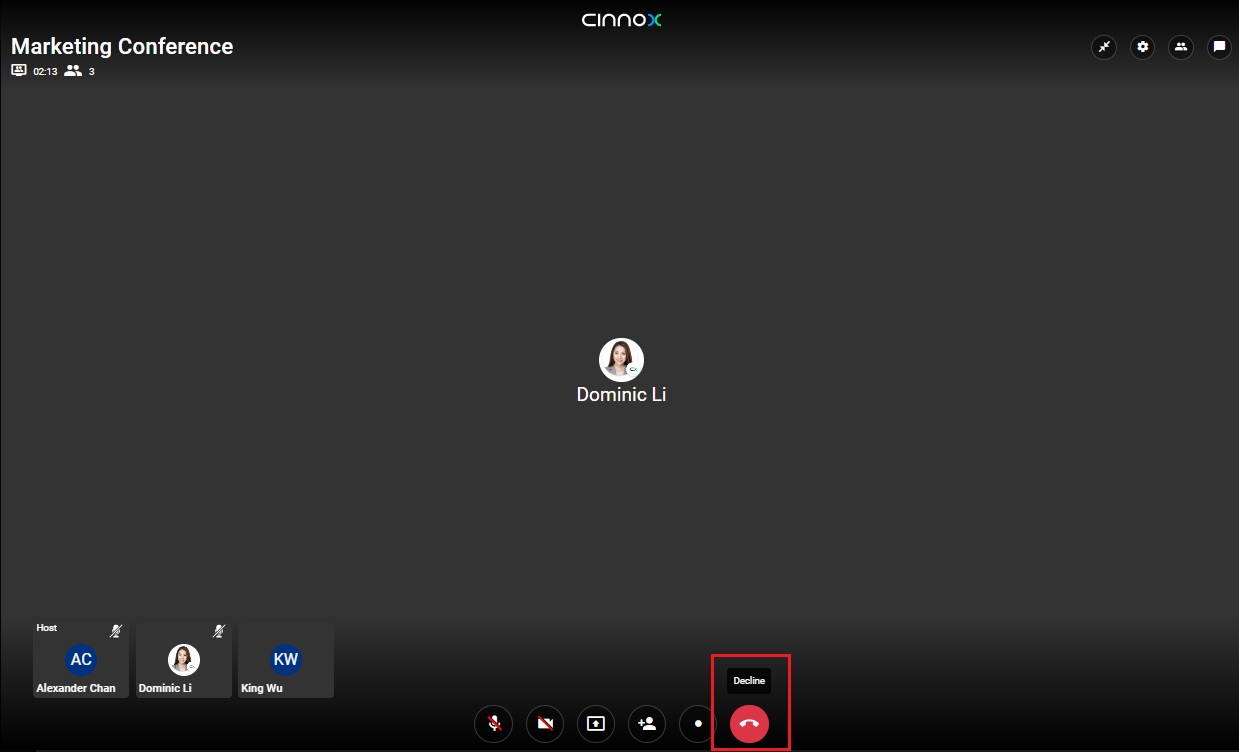 If you are the host or co-host, when you click Decline, the Conference pop-up window will appear, click End Conference to end the conference, and the conference will not run anymore.